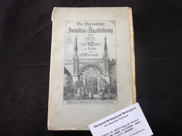 ULM.– WALESRODE, Ludwig: Die schwäbische Industrie-Ausstellung von 1871 in Ulm. In Briefen. Ulm (Wagner), 1882. XI, (1), 323 illustrirt mit Vignetten von J. Schnorr und Ansichten aus Ulm und der Ausstellung nach photographischen Aufnahmen auf 4 Tafeln. ill. OKart mit einer gestochenen Ansicht des Eingangsportals. Kanten unbeschnitten und tels bestoßen, etwas gebräunt, insgesamt ordentlich. Sehr seltenen EA. Heyd I, 2880.