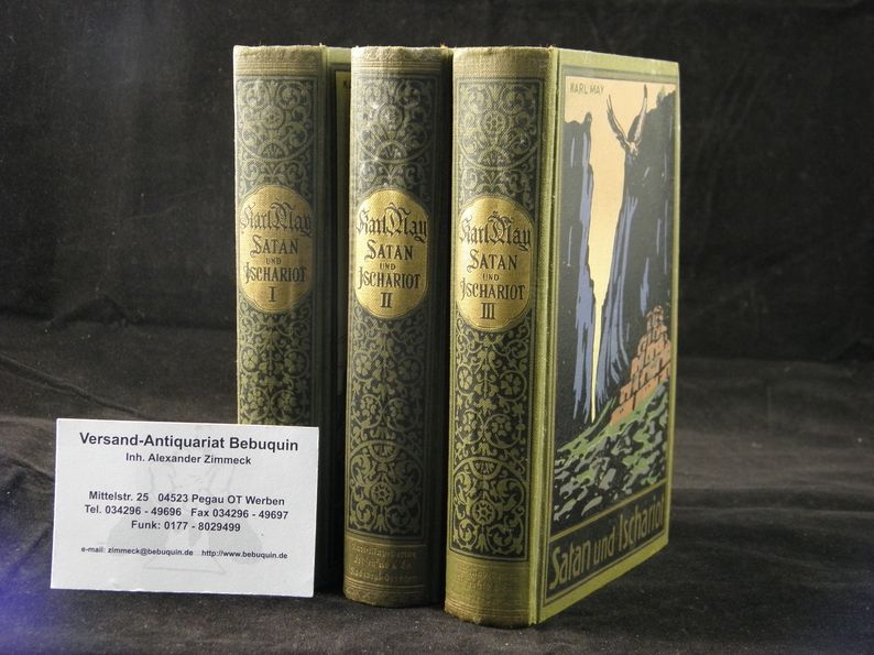 MAY, Karl: Satan und Ischariot. Reiseerzählung in 3 Bänden. 95.– 105., 92.– 102, 91.– 100. Tsd. Radebeul (Karl May), ca 1930. 470 (1) , 452 (3) , 478 (2) S. farb. ill. OLn. schöne Ausgabe. = Gesammelte Werke, Bd. 20 – 22. GW20.13P, 21.12P, 22.12P T2.