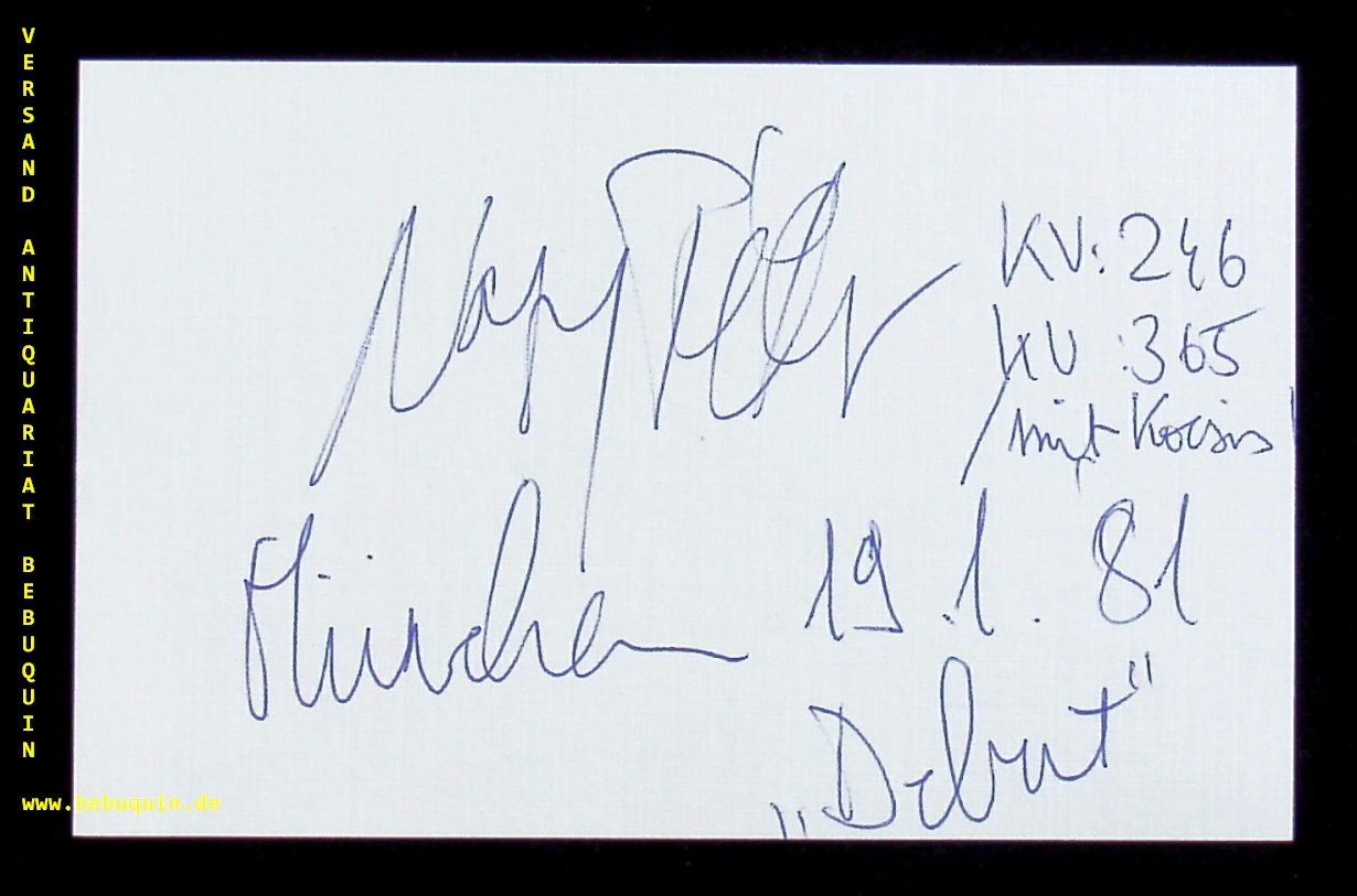 NAGY, Peter (Pianist): eigenhändig signierte und datierte Autogrammkarte. München Debut. München (Philharmonie), 19.1.1981. 8 x 12,5 cm. Karteikarte. Der erste Preis des ungarischen Radiowettbewerbs 1979 verhalf dem virtuosen Pianisten Péter Nagy zu einer bemerkenswerten internationalen Karriere, nachdem er sein Studium an der Liszt-Akademie in Budapest bereits im Alter von acht Jahren aufgenommen hatte.