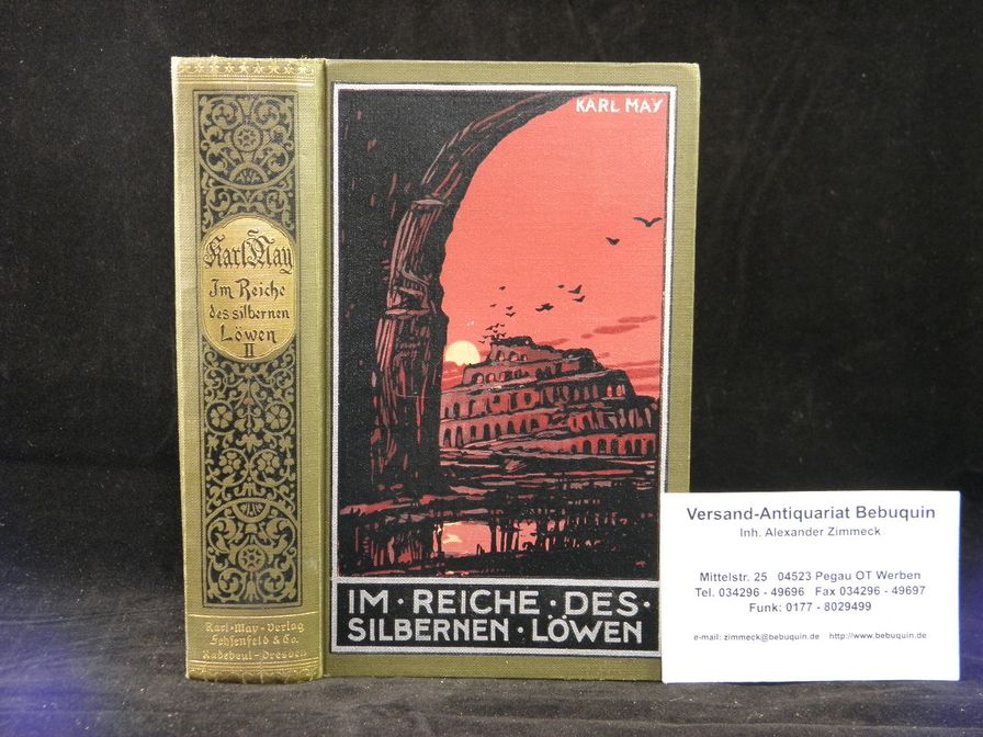 MAY, Karl: Im Reiche des silbernen Löwen. II. Band. Reiseerzählung. 108.– 122. Tsd. Radebeul (Karl May), (1939). 628 (3) S. farb. ill. OLn. feines Ex. mit leuchtendem Rückengold, vorderes Gelenk leicht gelockert. = Gesammelte Werke, Bd. 27. „Von dieser teilweise kriegszerstörten Auflage wurden bis zum 9.3.1944 höchstens 8900 Exemplare aufgebunden.“ Hermesmeier /Schmatz GW 27.15.