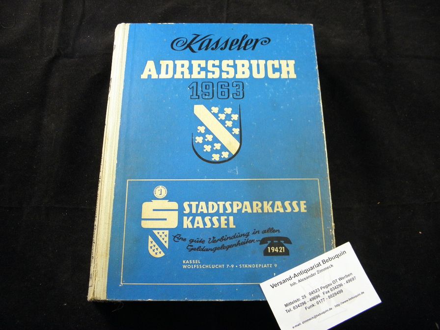 KASSEL.– KASSELER ADRESSBUCH 1963.– 123. Jahrgang. Kassel (Schönhoven), 1963. 4°. ca 1200 S. mit Abb. ill. OHLn. Rücken einseitig abgeplatzt, Titelseite leicht gelockert, sonst gut erhalten Enthält Dienstellen des Bundes, Namen- und Firmenteil, Straßen- und Häuserteil, Branchenteil und Handelsregister.