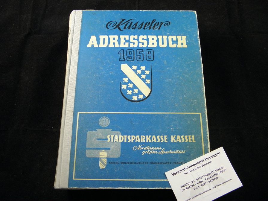 KASSEL.– KASSELER ADRESSBUCH 1958.– 118. Jahrgang. Kassel (Schönhoven), 1958. 4°. ca 1200 S. mit Abb. ill. OHLn. alter Rücken neu aufgezogen. Enthält Dienstellen des Bundes, Namen- und Firmenteil, Straßen- und Häuserteil, Branchenteil und Handelsregister.
