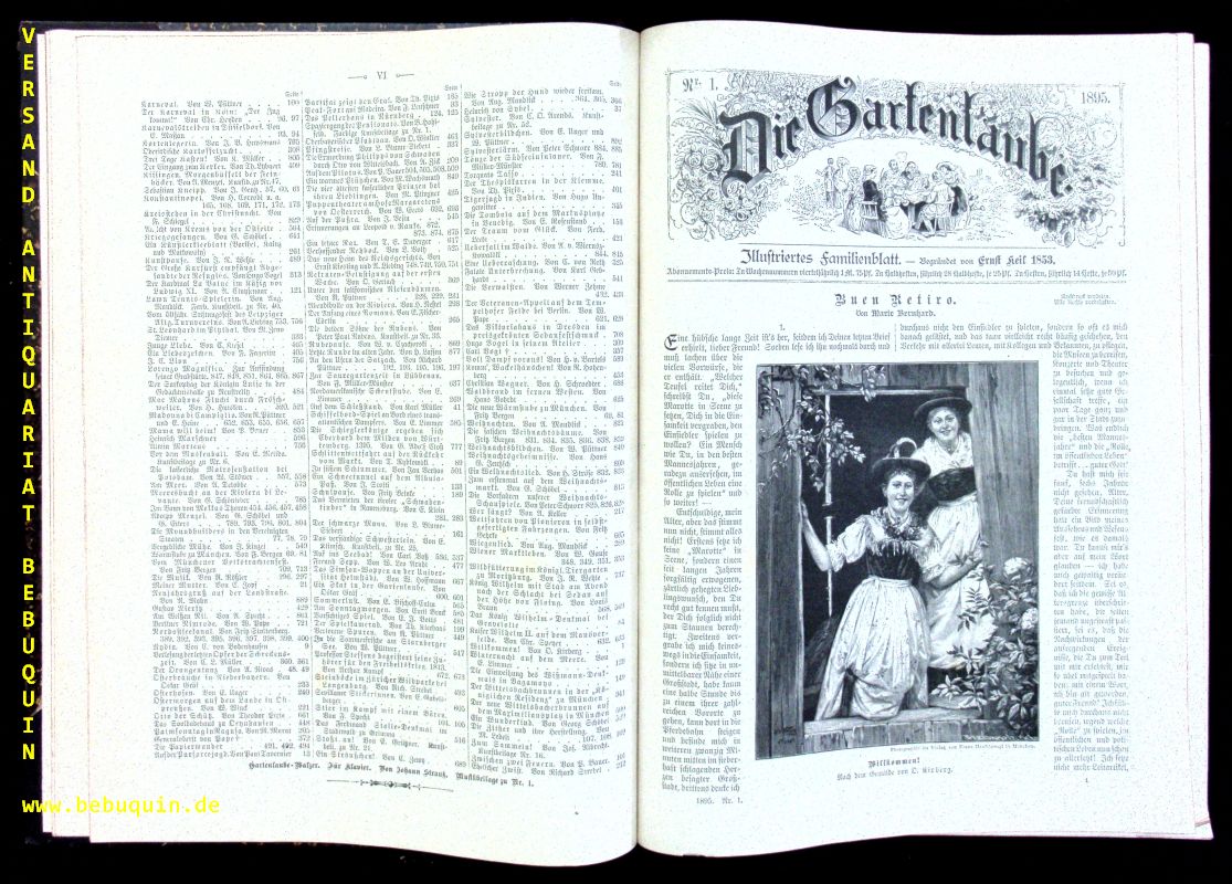 DIE GARTENLAUBE.– Illustrirtes Familienblatt. Jahrgang 1895. Leipzig (Keil), 1895. 4°. VI, 893 S. mit zahlr. Bildern im Text und auf Tafeln. HLdr mit goldgeprägtem Rücken. Kanten berieben. = 43. Jg. Textze von Felix Dahn, Marie Bernhard, Ida Boy-Ed (Die Lampe der Psyche), Perfall, Charlotte Niese u.a sowie Bildern von Auswandererbahnhof in Ruhleben, Barbierstobe, Bismarcks Geburtstagsfeier, Diskuswerfer, Sturmflut in Hamburg, 11er Husaren in Ligny, Kaiser Wilhelm Kanal, Heinrich Marschner, Alwin Martens, Heinrich vob Sybel u.v.a.