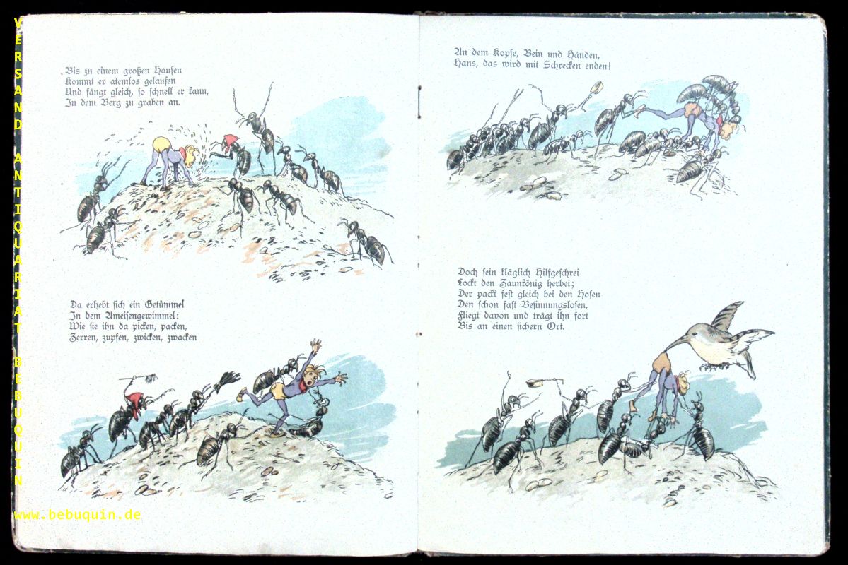 SCHOLZ KÜNSTLER BILDERBÜCHER.– SCHMIDHAMMER, Arpad: Der verlorene Pfennig. Hans Däumlings seltsame Abenteuer in 5 Kapiteln gereimt und gezeichnet. Mainz (Jos. Scholz), (1908). Gr. 4°. 14 Bl. mit farb. Bildern des Verfassers und farb. gestalteten Vorsätzen. ill. OHLn. mit farb. gestalteten Vorsatzpapieren. Einband und Kanten etwas berieben, vereinzelte Randeinrisse, insgesamt gutes Ex. = Das deutsche Bilderbuch. EA Ries 850; Klotz 6363/3.