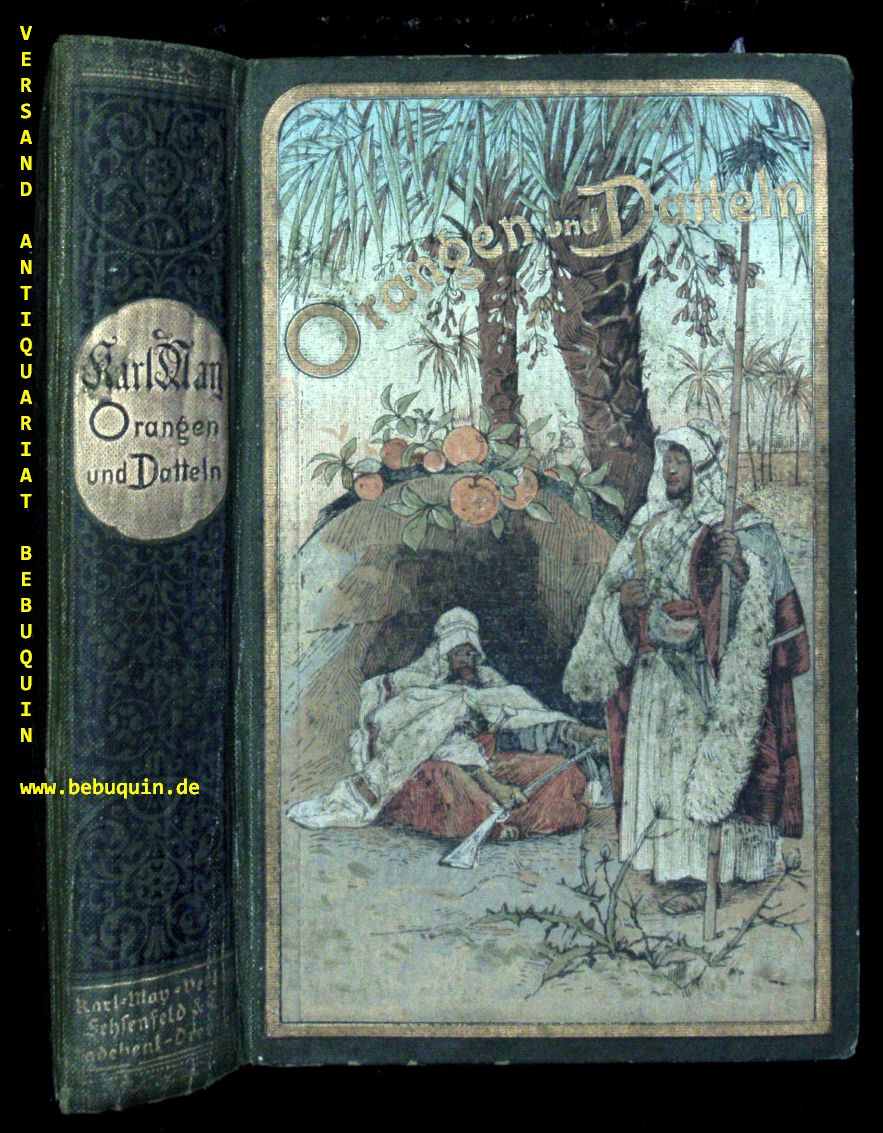 MAY, Karl: Orangen und Datteln. Reiseerzählungen. 54.– 58. Tsd. Radebeul (Karl May), (1919). 665 (2) S. farb. ill. OHLn. Kanten leicht berieben, Rücken gering knitterig, sonst sehr schönes Ex. = Gesammelte Werke, Bd. 10. Erstauflage bei Radebeul; Hermesmeler / Schmatz GW 10.11.