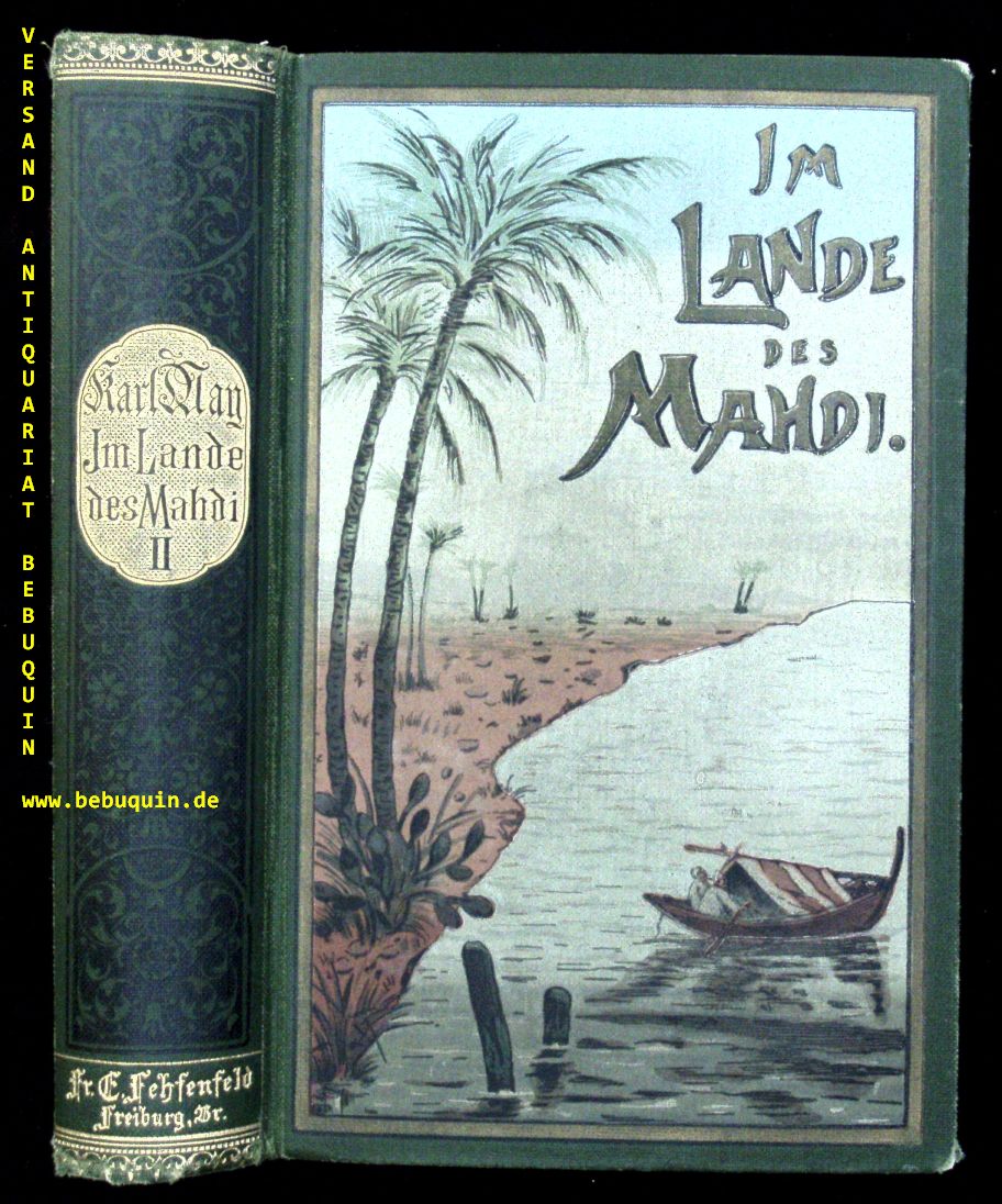 MAY, Karl: Im Lande des Mahdi. II. Band. Reiseerlebnisse. 31.– 35. Tsd. Freiburg (Fehsenfeld), (1909). 587 (1) S. ill. OLn. (DB 68). NaV, NaT, etwas leseschief, sonst feines Ex. mit goldglänzendem Rücken. = Karl Mays gesammelte Reiseromane Band XV. letzte Auflage bei Fehsenfeld. Plaul 279.7.