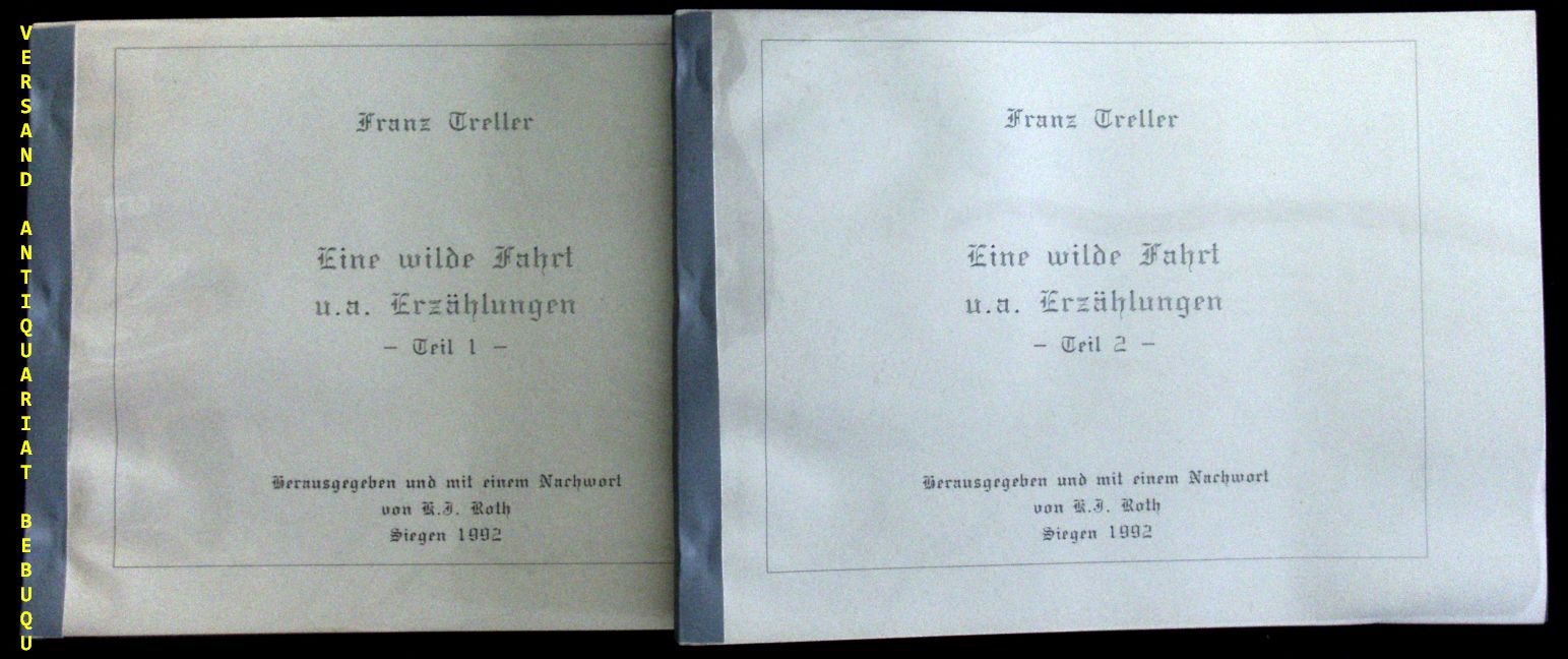 TRELLER, Franz: Eine wilde Fahrt und andere Erzählungen. Hrsg. und mit einem Nachwort von K.J. Roth. Typoscript der zwischen 1887 und 1911 erschienenen Titel. 2 Bände. Siegen (Roth), 1992. Quer 4°. 132, III einseitig bedruckte Bl. OHLn. feines Ex. = Abenteuer-Archiv Reihe 1. Seltene Zeitschriftenabdrucke. seltenes Text-Dokument.