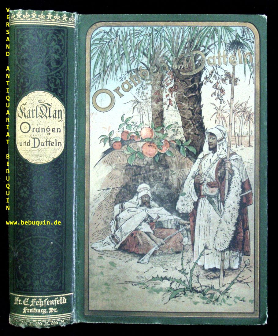 MAY, Karl: Orangen und Datteln. Reisefrüchte aus dem Oriente. 21.– 25. Tsd. Freiburg (Fehsenfeld), (1899). 665 S. farbstarker ill. OLn. mit goldglänzendem Rücken. S. 529 – 544 mit minimalem Eckverlust, StaT. = Gesammelte Reiseerzählungen, Bd. X. Seltene Ausgabe. Plaul 250.5.