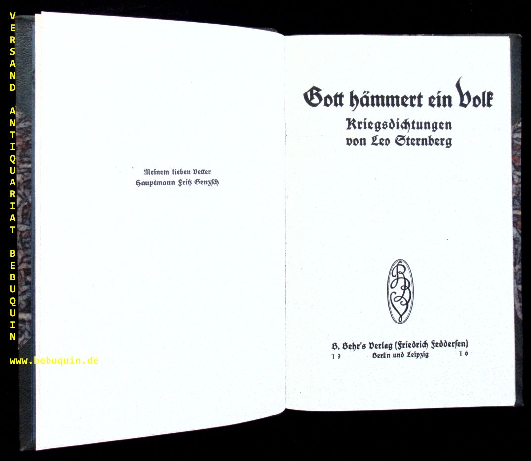 STERNBERG, Leo: Gott hämmert ein Volk. Kriegsdichtungen. Berlin (Feddersen), 1916. 80 (2) S. OHLdr mit goldgeprägtem Rücken. gutes Ex. seltene EA des Limburger Juristen im expressionistischen Ton. Kosch 2850.