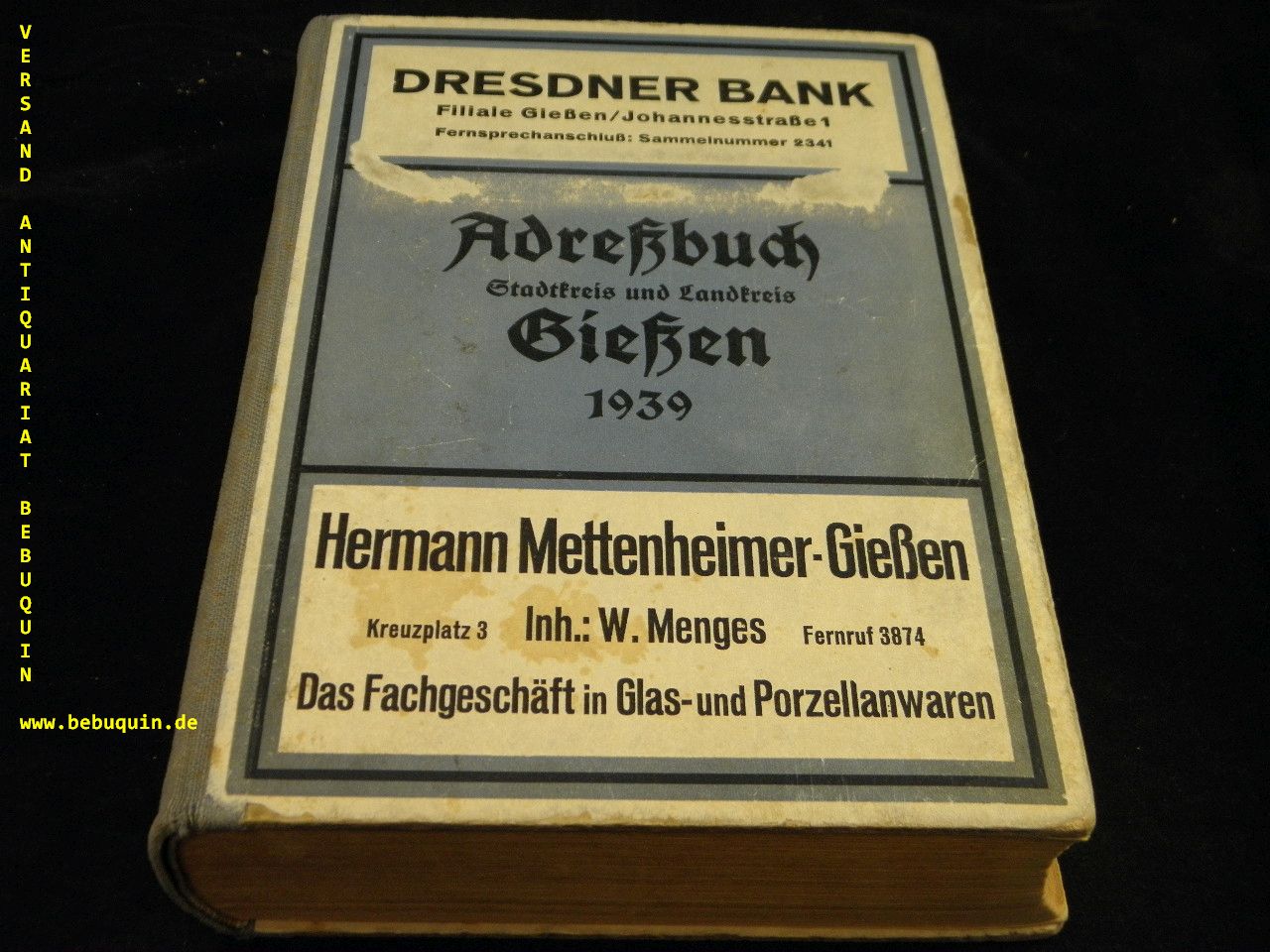 GIESSEN.– ADRESSBUCH STADTKREIS UND LANDKREIS GIESSEN 1939.– In 6 Abschnitten nach eigenen Aufnahmen bearb. Giessen (Oberhessischer), 1939. 4°. XXXII, 360, 232 s. farb. ill. OHLn. Einband etwas berieben, kaum gelockert, insgesamt gut erhalten. Mit einer Stadtgeschichte und der Sortierung nach Einwohner und Firmen in alphabetischer Reihenfolge, Einwohnerverzeichnis nach Straße und Hausnummer, Industrie, Handel und Gewerbe sowie Behörden und amtliche Einrichtungen.