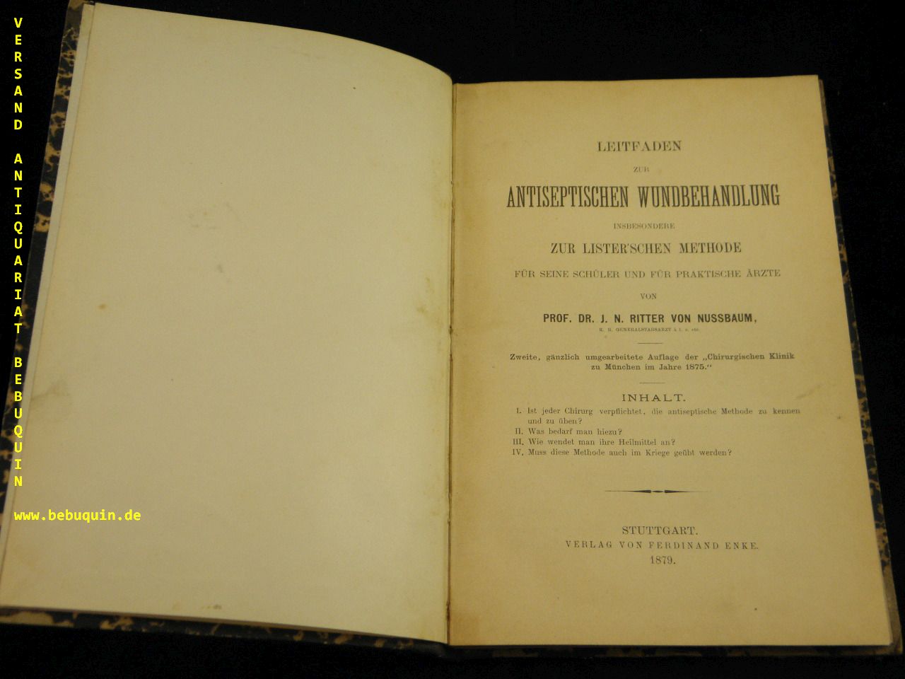 MEDIZIN.– RITTER VON NUSSBAUM, J.N.: Leitfaden zur antiseptischen Wundbehandlung. Insbesondere zur Lister’sxchen methode für seine Schüler und für praktische Ärzte. 2. gänzlich umgearb. Aufl. Stuttgart (Enke), 1879. IV, 160 S. HLdr. der Zeit. Kanten berieben Nußbaum war als Chirurg weit bekannt und führte im Laufe seines Lebens fast 25.000 Operationen durch, davon mehr als 600 Ovariotomien (Inzision oder Spaltung der Eierstöcke), eine Operation, die er in London bei Spencer Wells erlernt hatte. Weitere operative Schwerpunkte umfassten die Orthopädie sowie die Bauch- und Nervenchirurgie.