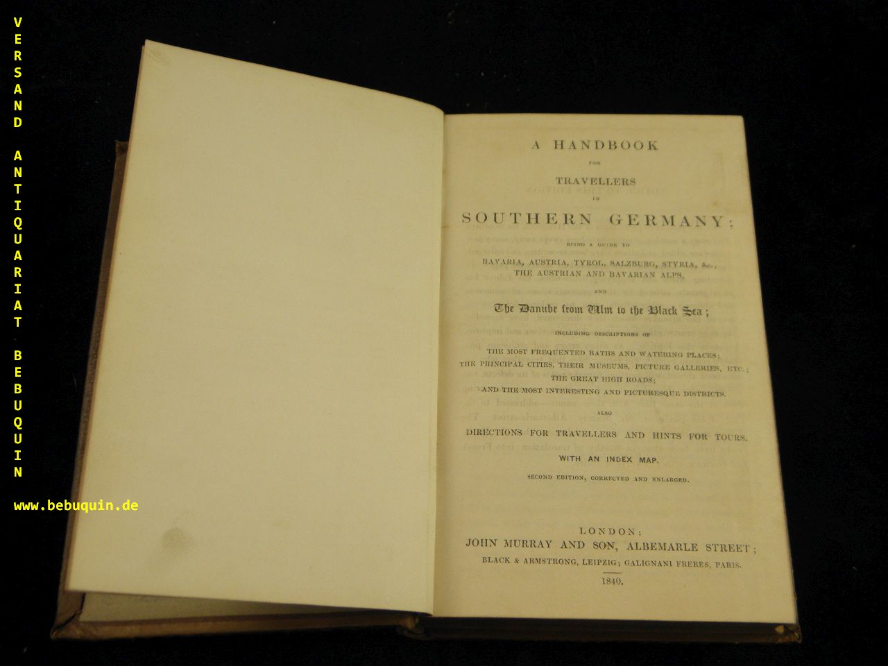DEUTSCHLAND.– A HANDBOOK FOR TRAVELLERS IN SOUTHERN GERMANY.– Being A Guide To Bavaria, Austria, Tyrol, Salzburg, Styria, &c, The Austrian And Bavarian Alps, And The Danube From Ulm To The Black Sea. 2. ed. corrected and enlarged. London (Murray), 1840. xiv, 488 pages including Index and folding cloth map at rear Kalbsldr ca 1900 mit goldgeprägtem Rücken. Rücken leicht berieben, vorderes Gelenk gelockert, NaV, feines Ex.