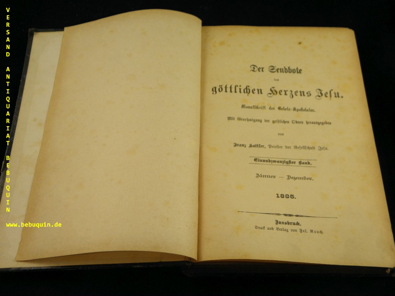HATTLER, Franz: (Hrsg.) Der Sendbote des göttlichen Herzens Jesu 1885. Monatsschrift des Gebets-Apostolates. Innsbruck (Rauch), 1885. 4°. 384 S. mit zahlr. Abb. HLn der Zeit. Rücken etwas abgeplatzt. = 21. Band. seltener Jahrgang.
