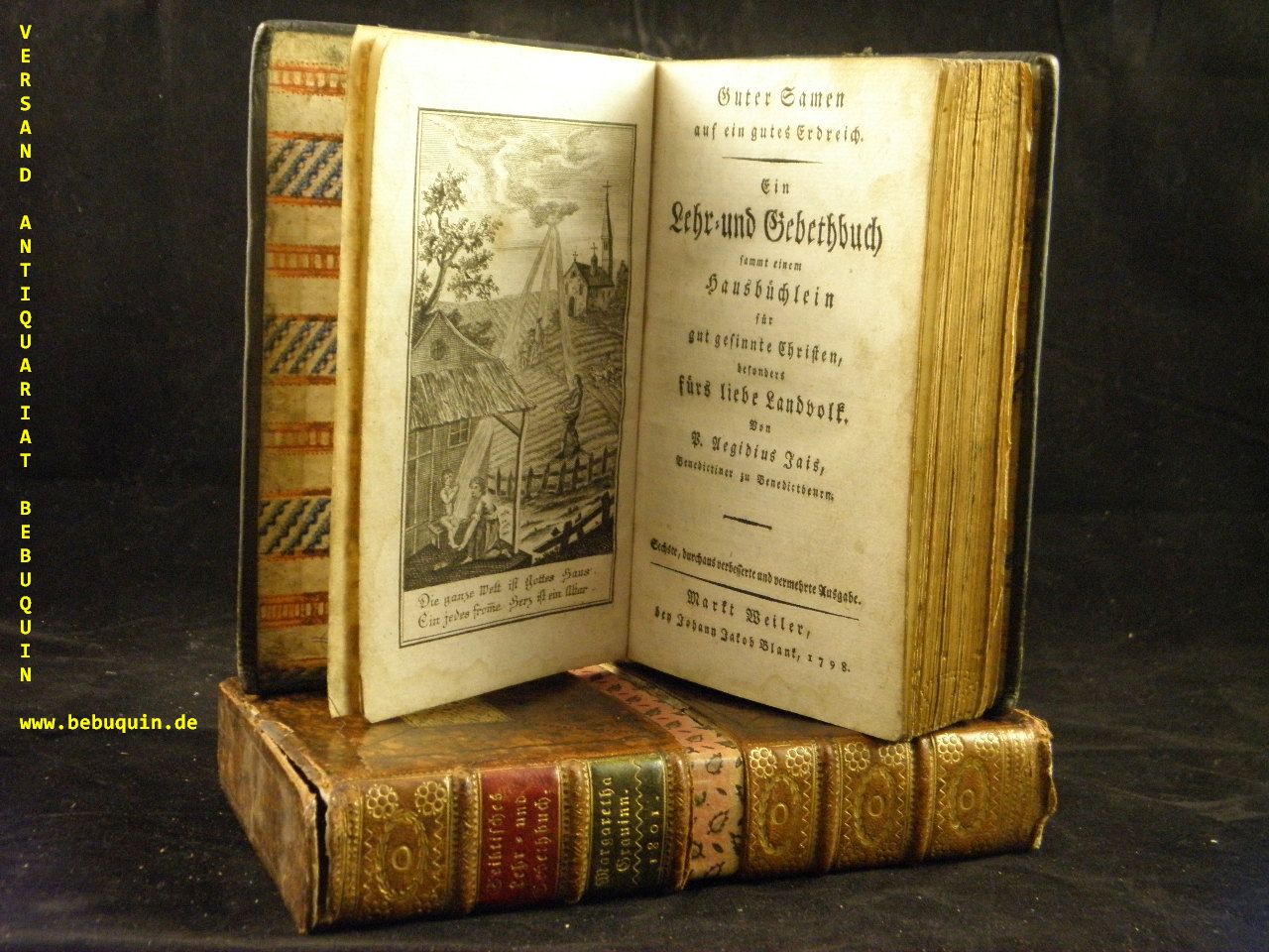 JAIS, P. Aegidius: Guter Samen auf ein gutes Erdreich. Ein Lehr-und Gebetbuch sammt einem Hausbüchlein für gut gesinnte Chrsiten, besonders fürs liebe Landvolk. 6. duirchaus verbesseerte und vermehrte Ausg., Markt Weiler (Johann Jakob Blank), 1798. XIV, 336 S. + 9 feine Kupfertafeln. OLdr mit goldgeprägten Deckeln und ebensfalls geoldgeprägtem Rücken auf 5 falschen Bünden in OSchuber mit ebenfalls goldgeprägtem Rücken mit dem goldgeprägten Rückenschild der Margaretha Grauinn von 1801. Einbandprägung geblichen, innen teils gebräunt und vereinzelt stockfleckig, die Tafeln wenig betroffen, insgesamt ein schönes Buch mit guter Patina. Jais war Benediktiner zu Benediktbeuren und Freund des Johann Michael Sailer. Wie dieser versuchte er Aufklärung und Theologie zu verbinden.