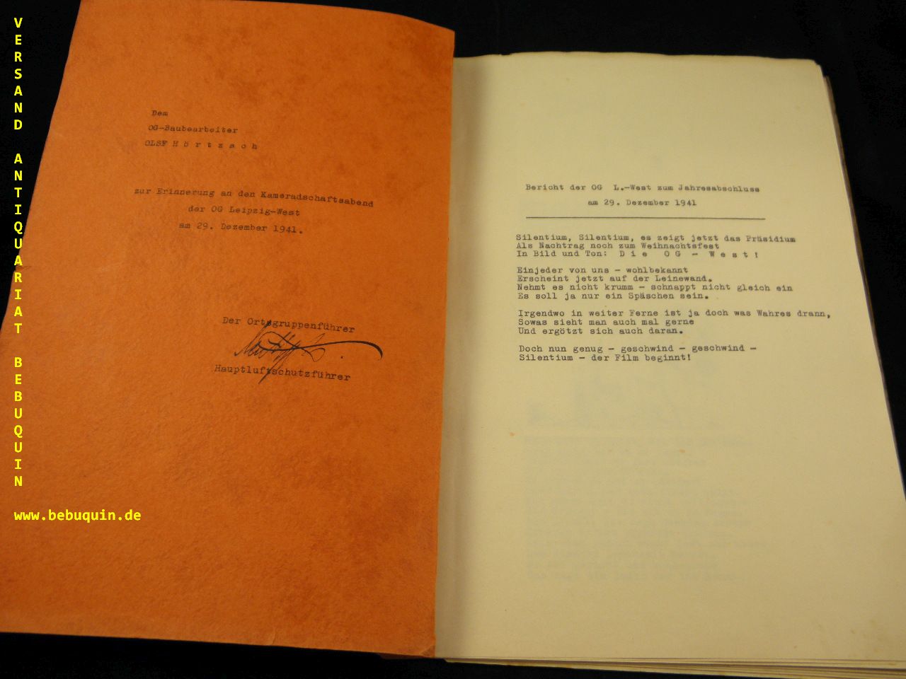LEIPZIG.– ORTSGRUPPE LEIPZIG – WEST KAMERADSCHAFTSABEND 1941.– Erinnerung und Bericht vom 29. Dezember 1941. Leipzig, 1941. 4°. 23 Bl. mit zahlr. mont. Zeichnungen als Filmgeschichte. schlichter OKart mit Kordelbindung. mittels Hektograhie hergestelltes Blatt. seltene Publikation der Leipziger Ortsgruppe zur Zeit der Luftschutzaktivitäten: ″ Bei der Firma Sack, im Westen – da sitzt einer von den Besten dieser Firma, Tag und Nacht, der auch mit im Luftschutz macht. Bredel, Walter – grosse Klasse – RG 19 – eigne Rasse. . .“