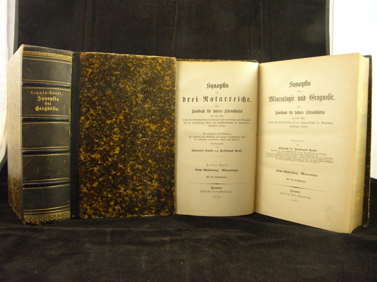 GEOLOGIE.– SENFT, Ferdinand: Synopsis der Mineralogie und Geognosie Ein Handbuch für höhere Lehranstalten und für Alle, welche sich wissenschaftlich mit der Naturgeschichte der Mineralien beschäftigen wollen. 2 Bände. Hahn sche Buchhandl., Hannover, 1876/78. Hannover (Hahn), 1876/78. Gr. 8°. XIX/XV/zus. 1332 S. mit 580, 122, 333 Holzschnitten. HLdr der zeit mit goldgeprägten Rücken. ein Rücken angeplatt, insgesamt gut erhalten.
