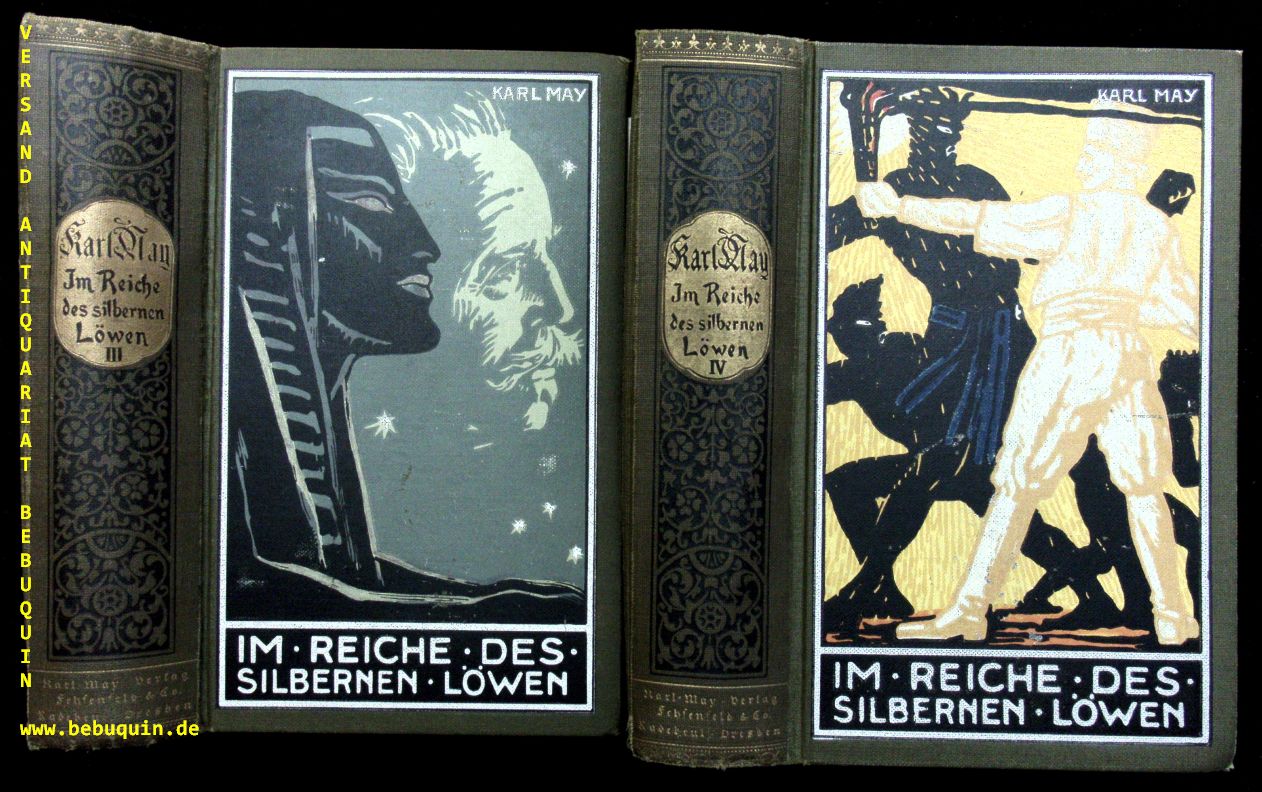 MAY, Karl: Im Reiche des silbernen Löwen. Bände I – IV. Reiseerzählung. 107.– 120., 97.– 107., 88.– 97., 94 – 107. Tsd. 4 Bände. Radebeul (Karl May), ca 1937. 491 (3), 628 (3), 636, 644(3) S. farb. ill. OLn. Bd. 2 etwas gelockert, leicht schief gelesen, Ecken teils bestoßen, insgesamt gut. = Gesammelte Werke, Bd. 26 – 29.