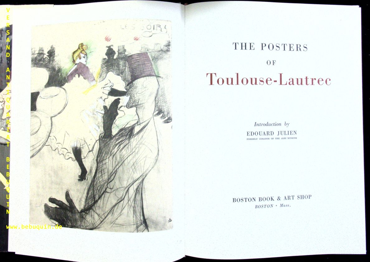 TOULOUSE-LAUTREC.– JULIEN, Edouard: (Intro) The Posters of Toulouse-Lautrec. Boston (Book & Art Shop), 1966. 37 x 28 cm. 97 (1) S. mit 32 farb. Bildtafeln. OLn mit OUmschl.– feines Ex. 1. amerikanische Ausgabe. Selten.