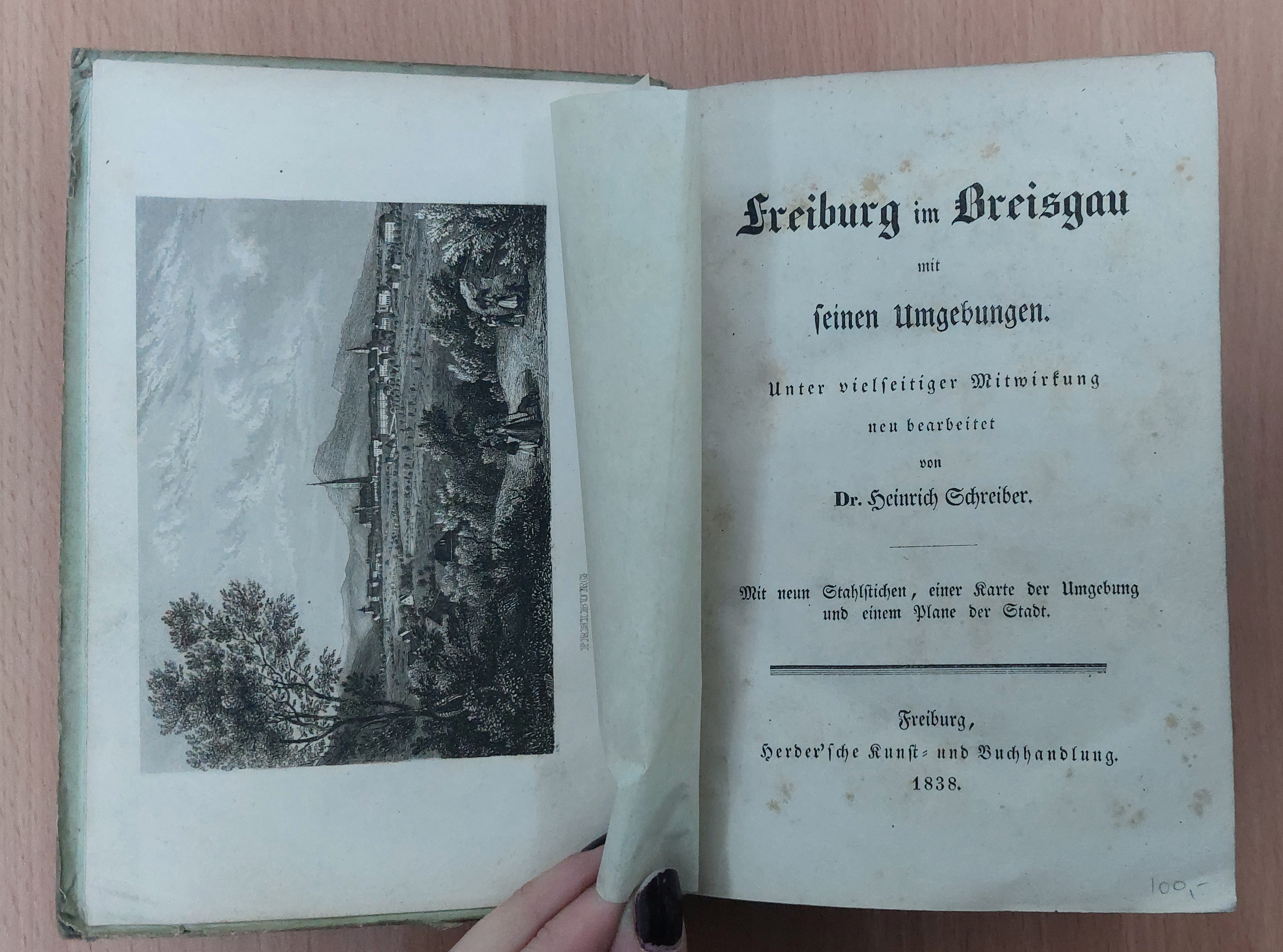FREIBURG.– SCHREIBER, Heinrich: Freiburg im Breisgau und seine Umgebungen. Unter vielseitiger Mitwirkung neu bearb. Freiburg (Herder), 1838. kl. 8°. XI, 444 S. mit 9 Stahlstichen und einem Plane der Stadt. ill. OPb. Deckel bestaubt, Kanten etwas berieben, innen sehr gut erhalten, die Umgebungskarte fehlt wie immer. EA. Johann Heinrich Nepomuk Schreiber (* 14. Juli 1793 in Freiburg im Breisgau; † 29. November 1872 ebenda) war Professor an der Universität und erster bedeutender Lokalhistoriker Freiburgs. (Wikipedia)