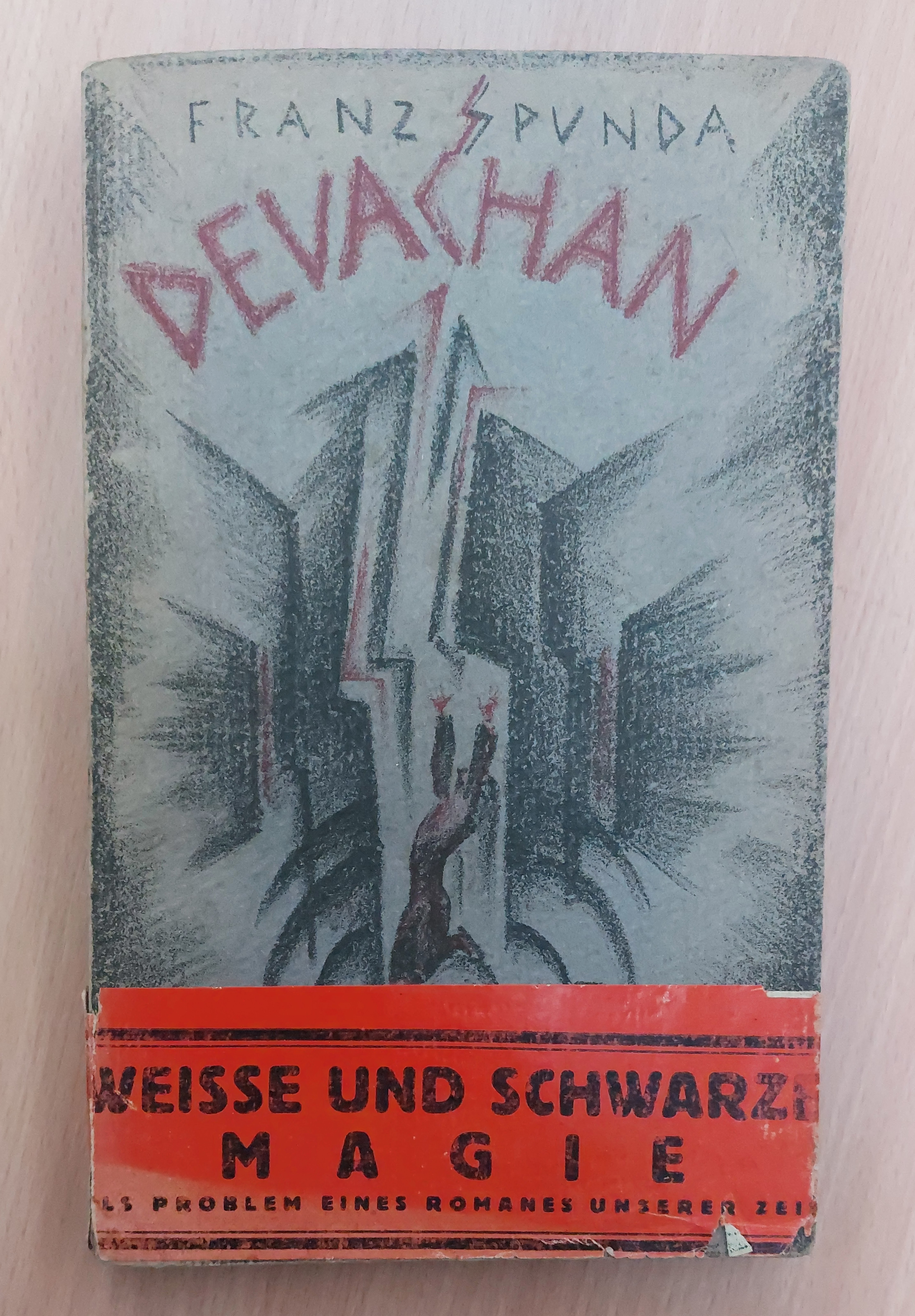 SPUNDA, Franz: Devachan. Magischer Roman. Wien (Strache), 1921. Gr. 8°. 217 (2) S. farb. ill. OKart mit einer mont. Bauchbinde: Weisse und schwarze Magie als Problem eines Romanes unserer Zeit. EA WG² 7. Bloch 2958.