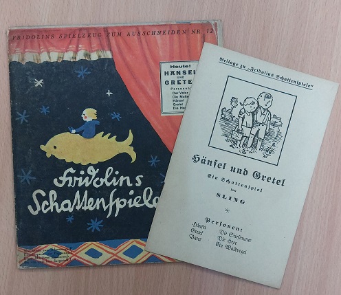 SLING: (D.i. Paul Schlesinger) Hänsel und Gretel. Fridolins Schattenspiele. Mit der Beilage. Berlin (Fridolin), ca 1925. 17 x 19,5 cm. 6 Bl. Leporello mit den plastischen Figuren zum Ausschneiden + 15 S. Beilage. farb. ill. OKart. etwas bestaubt, sonst von spektakulärer Erhaltung. = Fridolins Spielzeug zum Ausschneiden Nr. 12. von musealer Seltenheit. Paul Felix Schlesinger (* 11. Mai 1878 in Berlin; † 22. Mai 1928 ebenda) war ein deutscher Gerichtsreporter und der bekannteste der Weimarer Republik. Er veröffentlichte seine Reportagen unter dem Kürzel Sling. (Wikipedia).