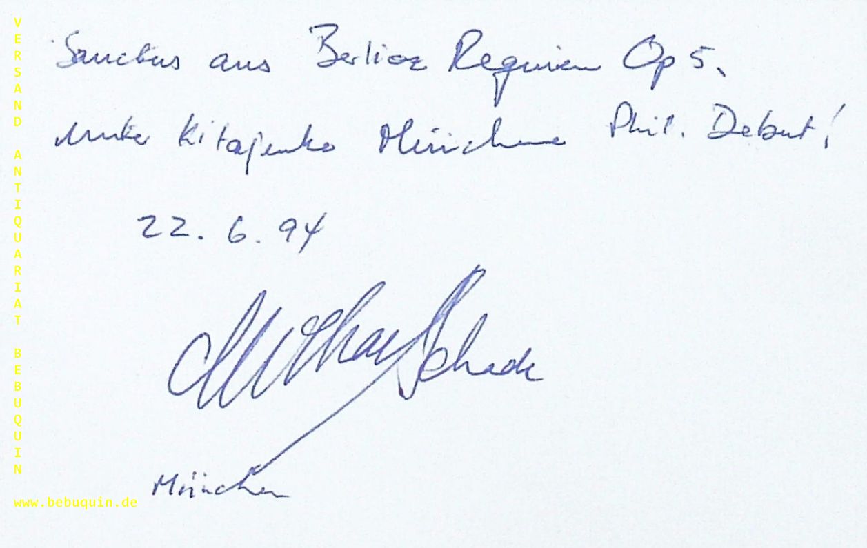 SCHADE, Michael (Tenor): eigenhändig signierte und datierte Autogrammkarte. München (Herkulessaal), 22.6.1994. 8 x 12,5 cm Karteikarte. Michael Schade (* 23. Januar 1965 in Genf) ist ein kanadisch-deutscher Opern-, Konzert- und Liedersänger. (Wikipedia)