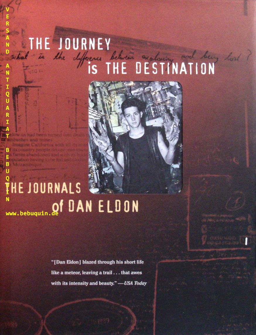 ELDON, Dan: The journey is the destination. The journals of Dan Eldon. San Francisco (Chronicle Books), 1997. 4°. 12, 214 S. reich und aufwendig bebildert. farb. ill. OPb mit OUmschl. mit Fenster. feines Ex. EA. Daniel Robert Eldon war ein britisch-kenianischer Fotojournalist, Künstler und Aktivist, der in Somalia als Fotojournalist bei Reuters getötet wurde. Seine Zeitschriften wurden posthum in vier Bänden von Chronicle Books veröffentlicht, darunter Die Reise ist das Ziel, Die Kunst des Lebens und Safari als Lebensform. (Wikipedia)