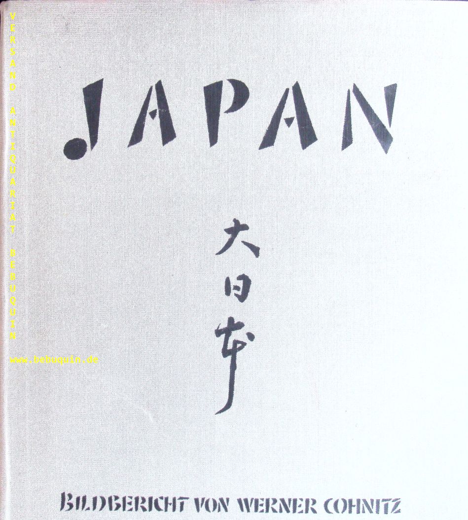 COHNITZ, Werner: Japan Bildbericht. Anläßlich der von der Deutsch-Japanischen Gesellschaft veranstalteten Ausstellung Werner Cohnitz: „Japan im Bild“. Berlin (Wilhelm Meister), 1942. 47 x 37 cm. Doppelblatt mit Titel und Inhaltsverzeichnis + 24 (von 25) Bildtafeln OLnMappe mit schwarzgeprägtem Titel. Einband gering angestaubt, die Tafeln von feiner Erhaltung, es fehlt Bild 8. Nr. 60 der in einer einmaligen Kleinstauflage erschienenen Veröffentlichung des Pressefotografen Werner Cohnitz (1909 – 1952), der im Sommer 1942 aus Japan zurückgekehrt war, wahrscheinlich per U-Boot. Cohnitz war seit 1928 Pressefotograf in Berlin, im Zweiten Weltkrieg Bildberichterstatter bei der Kriegsmarine. 1952 nahm er sich in Frankfurt das Leben.