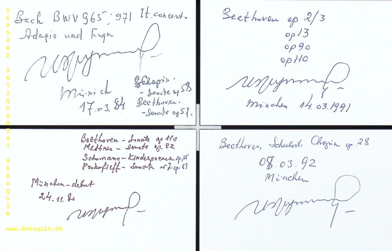 SHUKOW, Igor (Pianist): 7 eigenhändig signierte und datierte Autogrammkarten. München (Herkulessaal), 1980 – 19921. 8 x 12,5 cm. 7 Karteikarten. Igor Michailowitsch Schukow (* 31. August 1936 in Gorki; † 26. Januar 2018 in Moskau) war ein russischer Pianist und Dirigent. (Wikipedia)