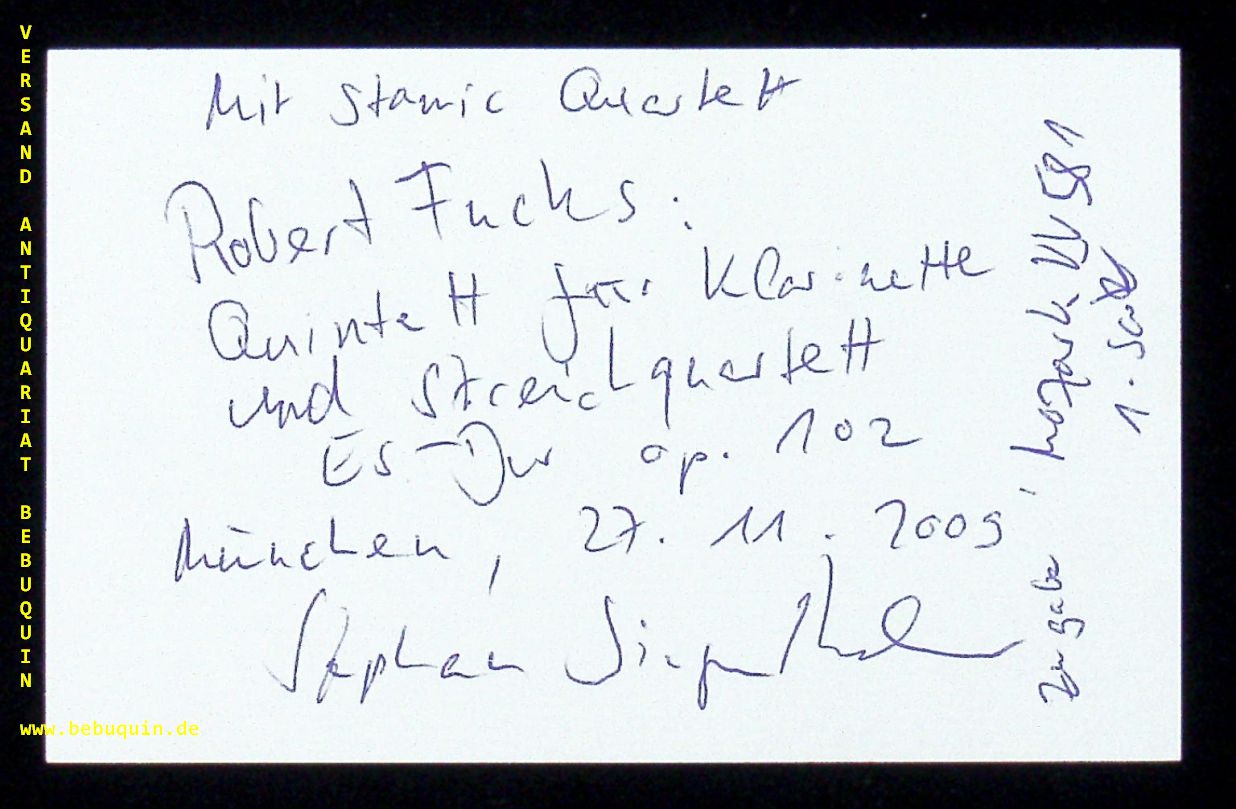 SIEGENTHALER, Stephan (Klarinettist): eigenhändig signierte und datierte Autogrammkarte. München (Herkulessaal), 27.11.2009. 8 x 12,5 cm. 6 Karteikarten. Stephan Siegenthaler (* 1957 in Biel/Bienne) ist ein Schweizer Unternehmer, Klarinettist und Hochschulrektor. (Wikipedia)
