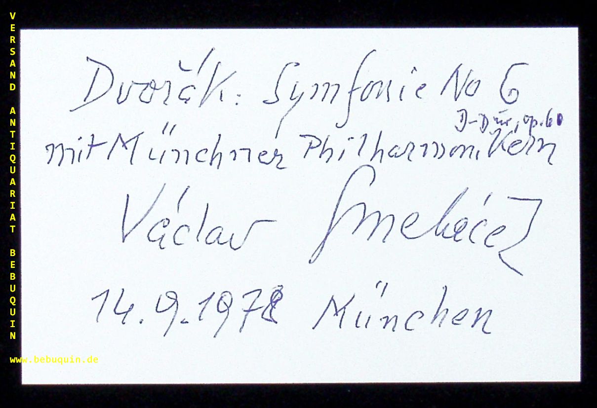 SMETACEK, Vaclav (Dirigent): eigenhändig signierte und datierte Autogrammkarte. München (Philharmonie), 14.9.1978. 8 x 12,5 cm. Karteikarte. Václav Smetácek (* 30. Juni 1906 in Brünn; † 18. Februar 1986 in Prag) war ein tschechischer Dirigent, Komponist und Oboist. (Wikipedia)