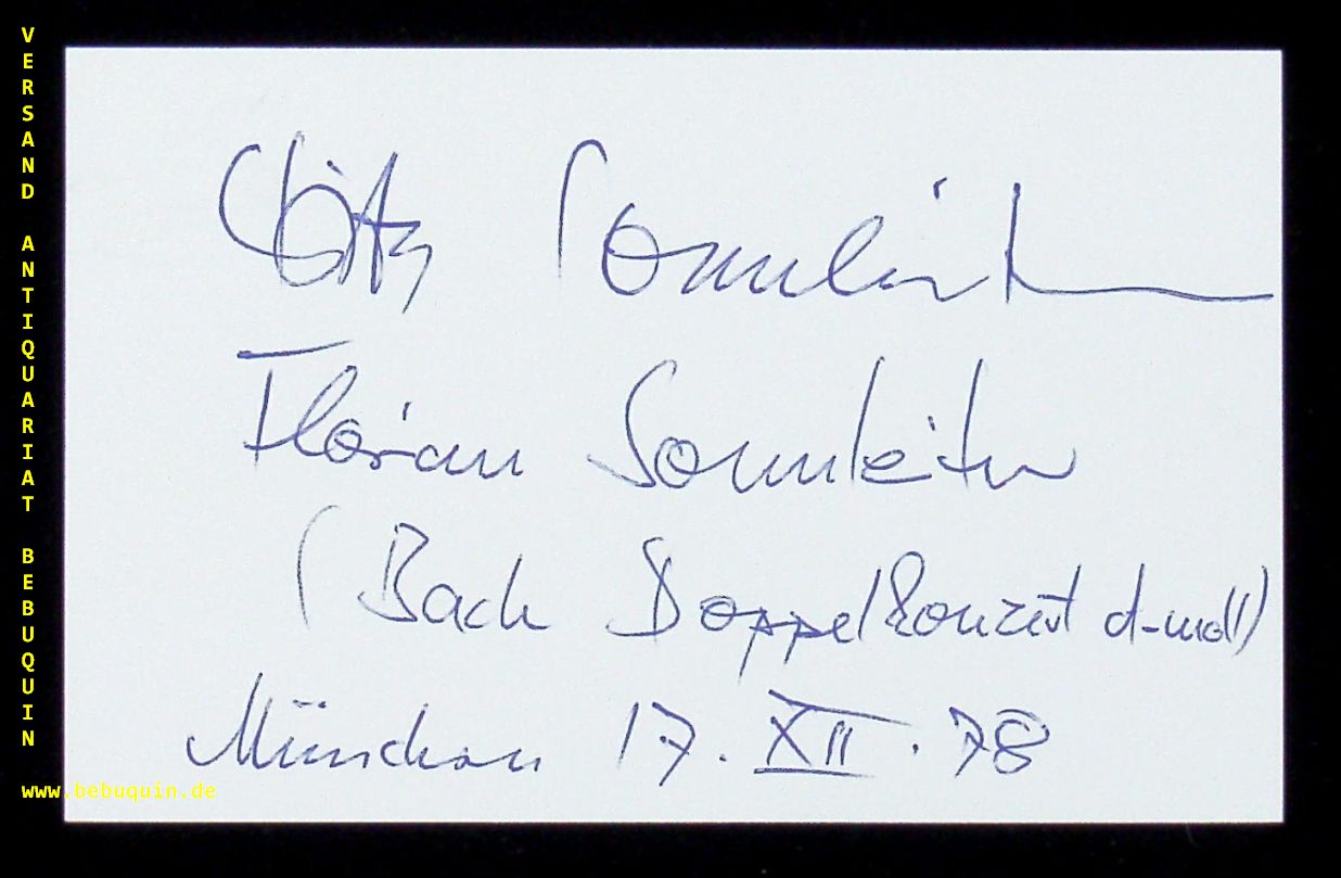 SONNLEITNER, Fritz + Florian (Violinist, Dirigent): eigenhändig von beiden signierte und datierte Autogrammkarte. München, 17.12.1978. 8 x 12,5 cm. Karteikarten. 1980 wurde Florian Sonnleitner Preisträger beim Deutschen Musikwettbewerb in Bonn und 1981 beim Internationalen Musikwettbewerb der ARD in München. Seit 1986 ist er Erster Konzertmeister im Symphonieorchester des Bayerischen Rundfunks. Hier mit seinem Vater.