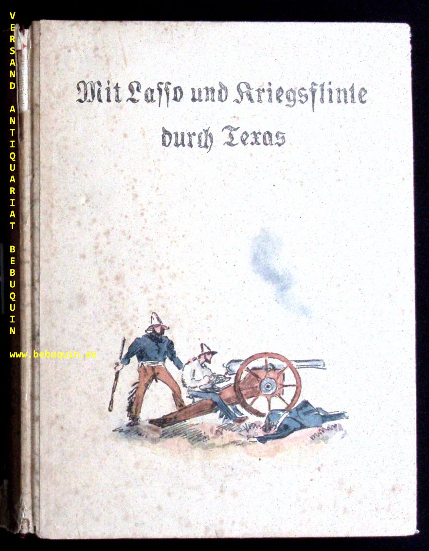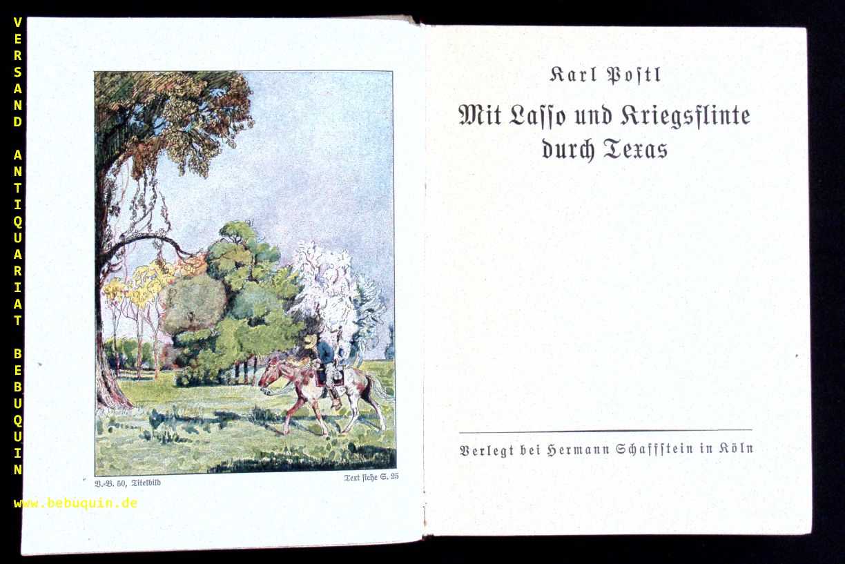 POSTL, Carl: Mit Lasso und Kriegsflinte durch Texas. 15.– 17. Tsd. Köln (Schaffstein), (1943). 130 (2) S. mit 4 Farbtafeln von A. Eckener. OHLn. Einband braunfleckig, Rücken lädiert, innen gut. 1. und einzige Aufl. der letzten Bearbeitung des „Kajütenbuchs“. Klotz 6709/51.