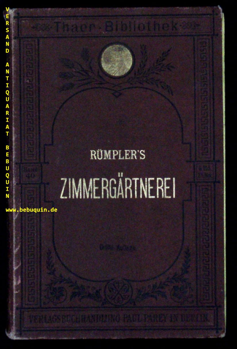 BOTANIK.– MÖNKEMEYER, W.: (Bearb.) Rümpler’s Zimmergärtnerei. Anleitung zur Zucht und Pflege der für die Unterhaltung in bürgerlichen Wohnräumen geeignetsten Ziergewächse. 3. Aufl. Berlin (Parey), 1895. 2 Bl., 276 S. mit 131 Textabb. ill. OLn. Gelenke etwas gelockert.