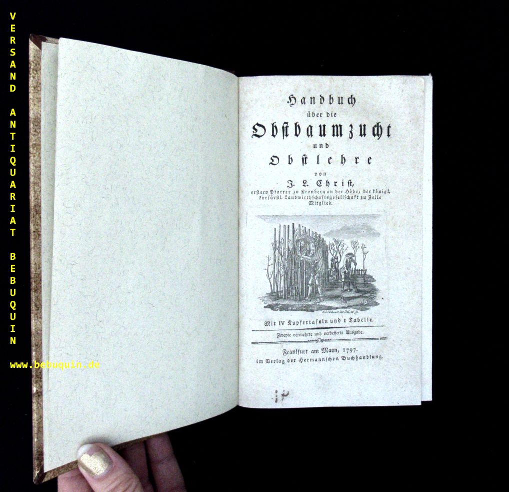 POMOLOGIE.– CHRIST, Johann Ludwig: Handbuch über die Obstbaumzucht und Obstlehre. 2. verm. u. verb. Ausg. Frankfurt a. M. (Hermann), 1797. XXXVI, 900 S Mit 4 Kupfertafeln, 1 Tabelle und 1 gestochenen figürlichen Frontispiz. n eueres HLdr mit goldgeprägter Rückenschrift. sehr feines Ex. Johann Ludwig Christ (* 18. Oktober 1739 in Öhringen; † 19. November 1813 in Kronberg im Taunus) war ein deutscher Pfarrer, Obstbauexperte und Insektenkundler. (Wikipedia)