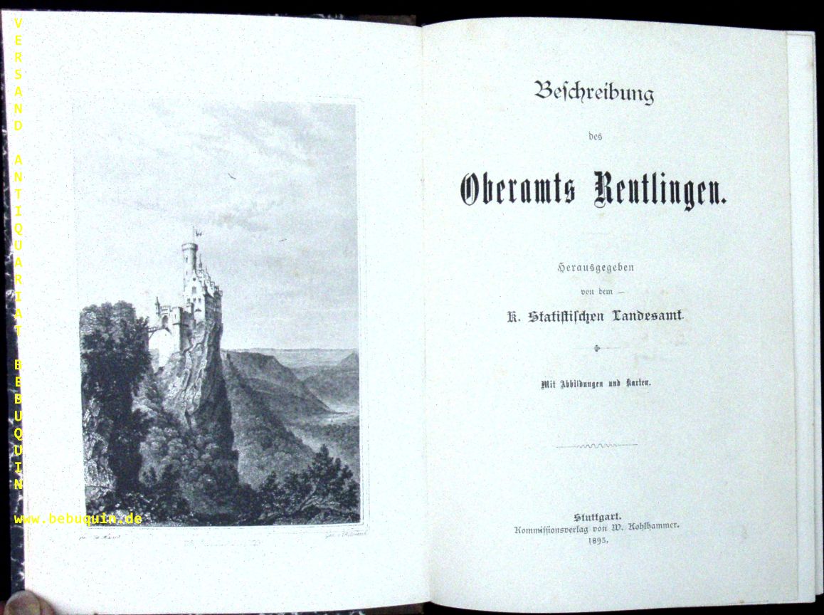 REUTLINGEN.– BESCHREIBUNG DES OBERAMTS REUTLINGEN.– Hrsg. vom K. Statistischen Landesamt. 2 Bände in 1 Bd. Stuttgart, K(ohlhammer), 1893. XIII, 504 + 500 Seiten. Mit 6 Tafeln (darunter 1 farb. und 2 gefalt.), 3 farb. Karten, 1 gefalt. Plan und 1 gefalt. Oberamtskarte (komplett). HLn der Zeit. gutes Ex. EA.