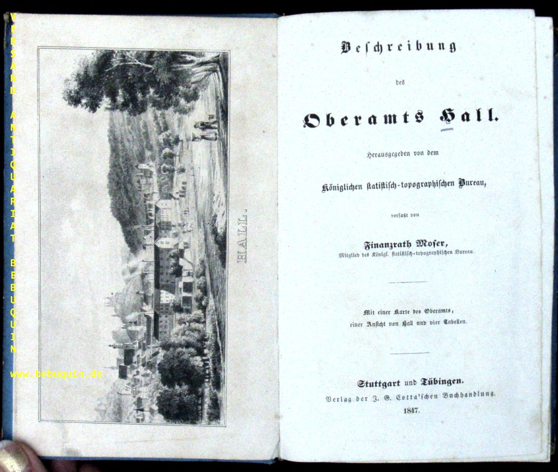 HALL.– MOSER, Rudolph Friedrich von: Beschreibung des Oberamts Hall. Hrsg. von dem Königlich statistisch-topographischen Bureau. Stuttgart/Tübingen, Cotta, 1847. IV, 325 S., 1 Bl. mit einer Karte des Oberamts, einer Ansicht von Hall und vier Tabellen. Pb der Zeit NaV, Kanten etwas berieben, gutes Ex. EA.