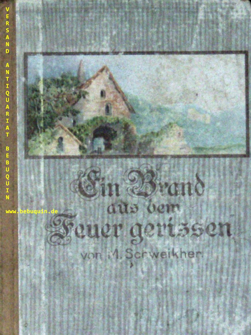 SCHWEITHER, Marie: Ein Brand aus dem Feuer gerissen. Trachtet nach dem das droben ist. Zwei Erzählungen für Jung und Alt. Konstanz (Hirsch), ca 1920. kl. 8°. 63 S. mit 2 Buntbildern, ill. OHLn. mit mont. Farbbild. Kanten berieben, eine Seite mit Eckknick. EA.