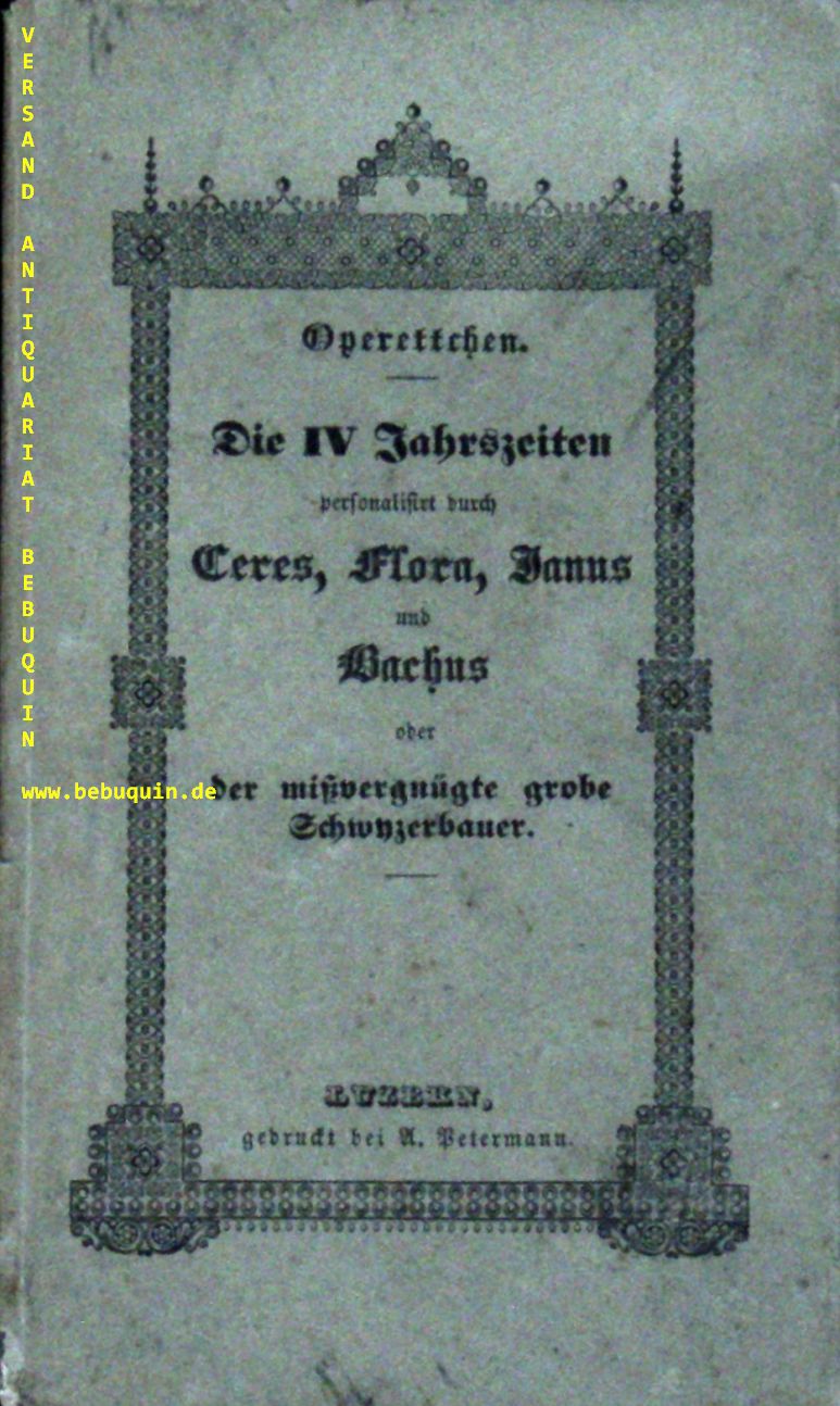 TRYNER, K.J.: (hier als 72jähriger Eremit zu Ried, nächst Schwyz) Die vier Jahreszeiten, personalisirt durch Ceres, Flora, Bachus & Janus. oder der mißvergnügte große Schwyzerbauer. Zur Abendunterhaltung während der Fastnacht. Größtentheils in Schwyzerdialekt zusamengestoppelt. Operettchen. Luzern (Petermann), 1840. kl. 8°. 36 S. ill. OPb. Rücken lädiert, sonst gutes Ex. seltene EA.