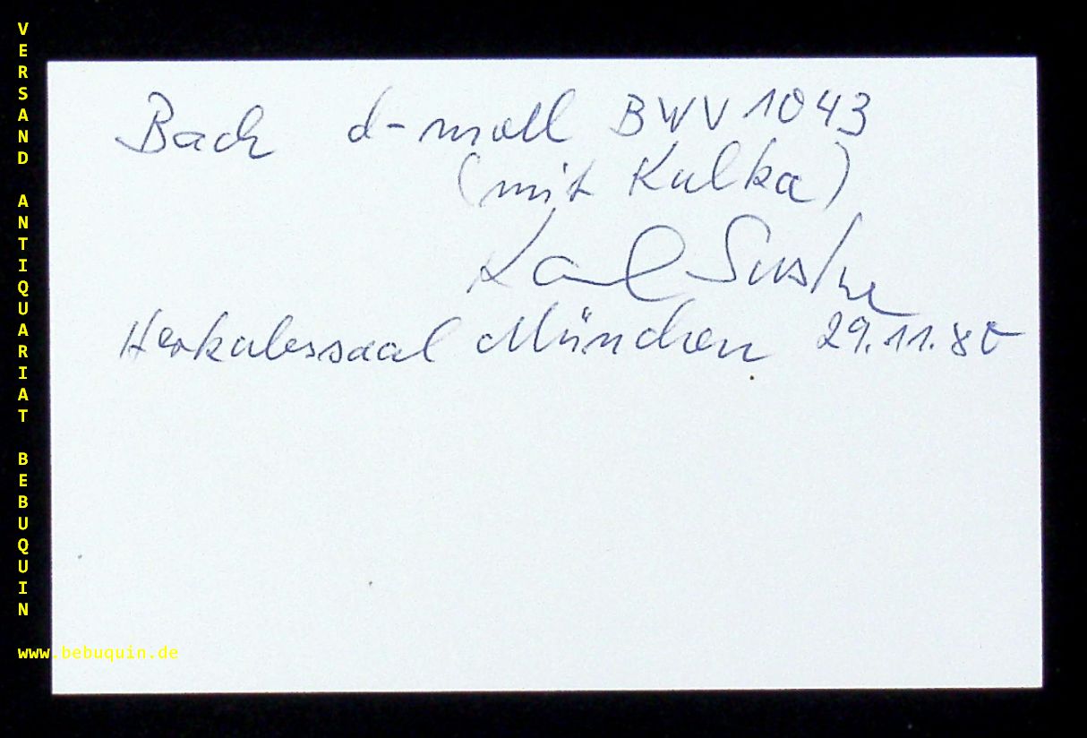SUSKE, Karl (Violinist): eigenhändig signierte und datierte Autogrammkarte, München (Philharmonie), 29.11.1980. 8 x 12,5 cm. Karteikarte. Karl Johann Suske (* 15. März 1934 in Reichenberg, Tschechoslowakei) ist ein deutscher Geiger. Im Laufe seiner mehr als vierzigjährigen Musikerlaufbahn war Suske unter anderem Erster Konzertmeister der Staatskapelle Berlin, des Gewandhausorchesters Leipzig sowie des Festspielorchesters Bayreuth. Zudem war er Mitglied des Leipziger Gewandhaus-Quartetts und Gründer eines nach ihm benannten Quartetts in Berlin. (Wikipedia).