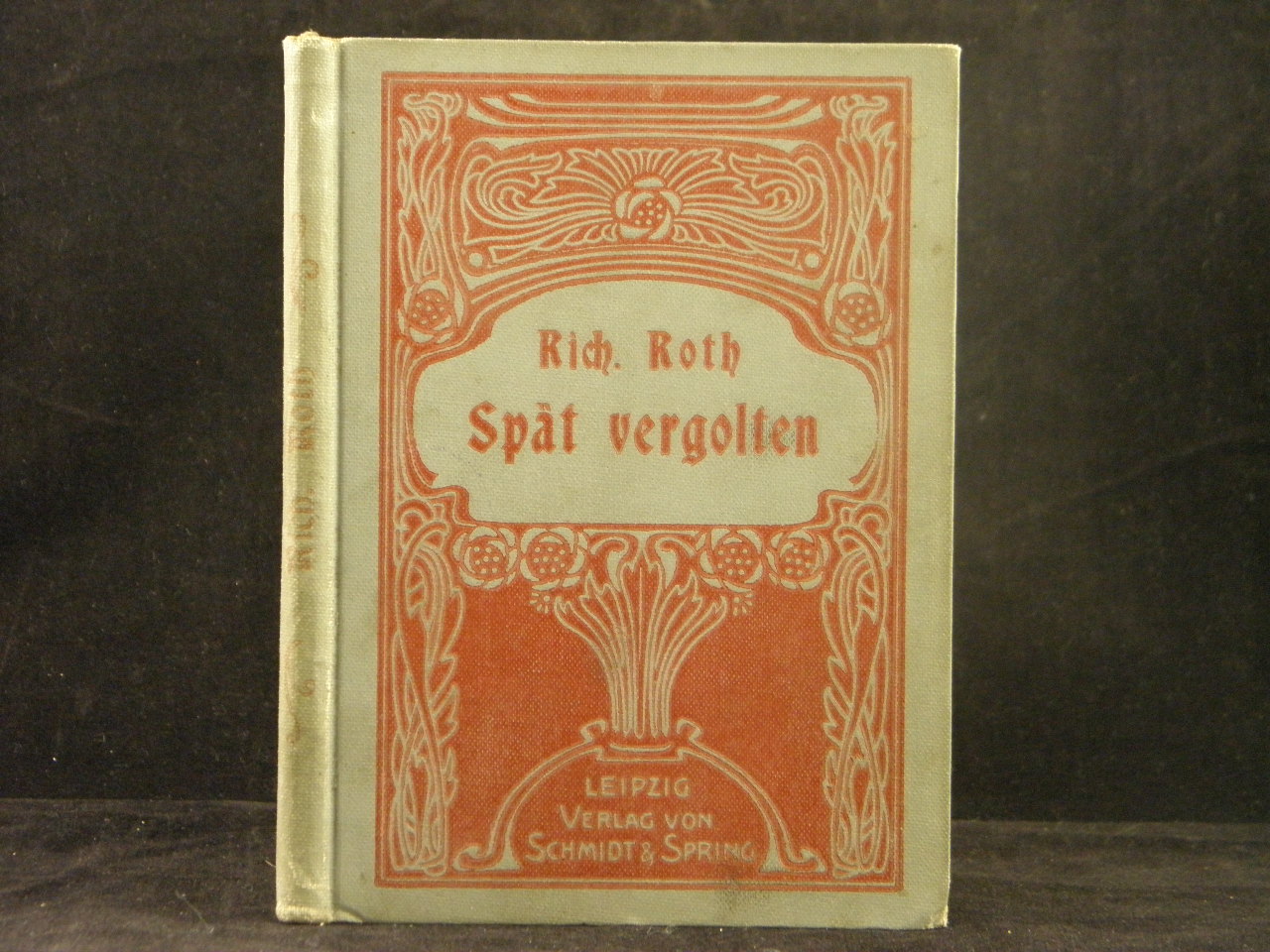 ROTH, Richard: Spät vergolten. Stuttgart (Schmidt & Spring), (1905). 12°. 88 (8) S. mit 4 Bildern. ill. OLn mit Jugendstilornamentik. Schnitt mit Fleck, sonst gut erhalten. EA. Klotz 6016/36.