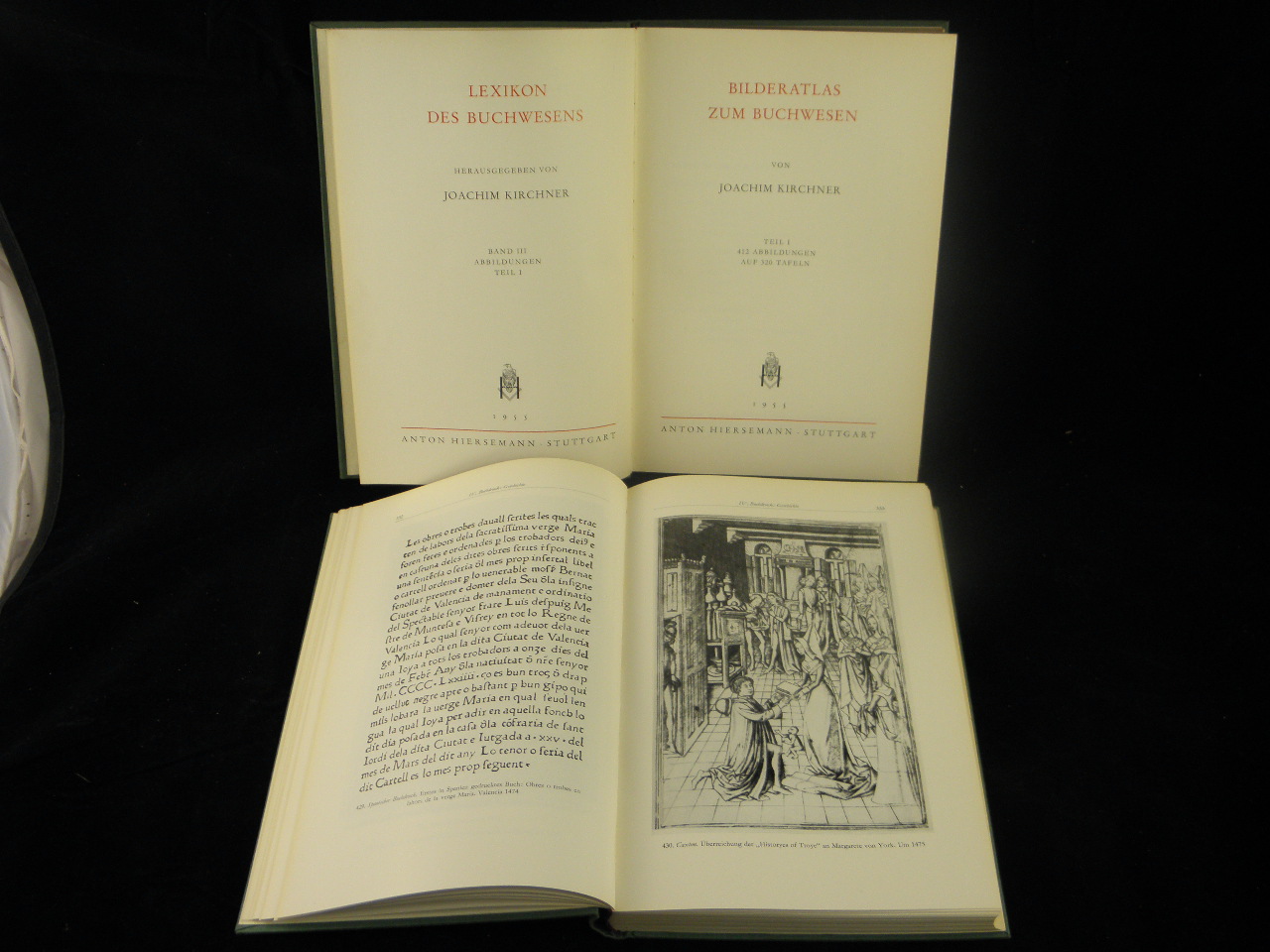 KIRCHNER, Joachim: Bilderatlas zum Buchwesen. Teil I + II. 2 Bände. Stuttgart (Hiersemann), 1955/56. Gr. 8°. XXXIX S. + 412 Abb. auf 320 Tafeln und XLVII S. + 545 Abb. auf 324 Tafeln. OLn mit goldgeprägter Deckelvignette. gutes Ex. = Lexikon des Buchwesens, Bd. III + IV. EA.