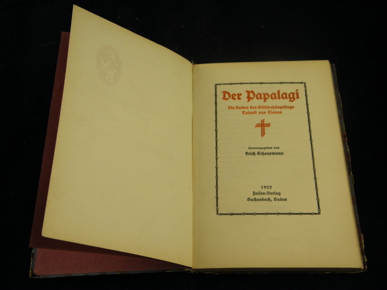 SCHEURMANN, Erich: Der Papalagi. Die Reden des Südseehäuptlings Tuiavii aus Tiavea Buchenbach (Felsen), 1922. 116 (4) S. OPb. Rücken teils abgeplatzt. EA