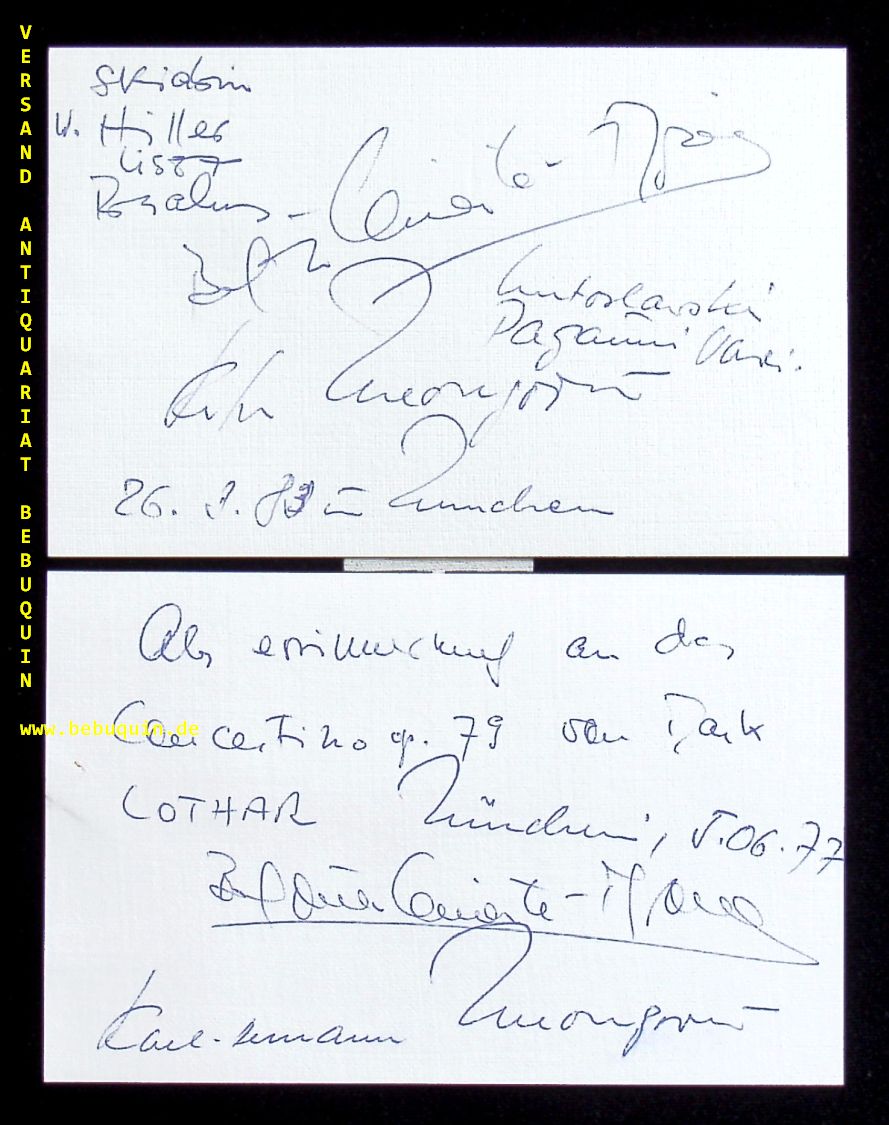 URIARTE, Begonia + MRONGOVIUS, Kar-hermann (Klavier-Duo): 2 eigenhändig von beiden signierte und datierte Autogrammkarten. München (Philharmonie), 1977 + 1982. 8 x 12,5 cm. 2 Karteikarten.