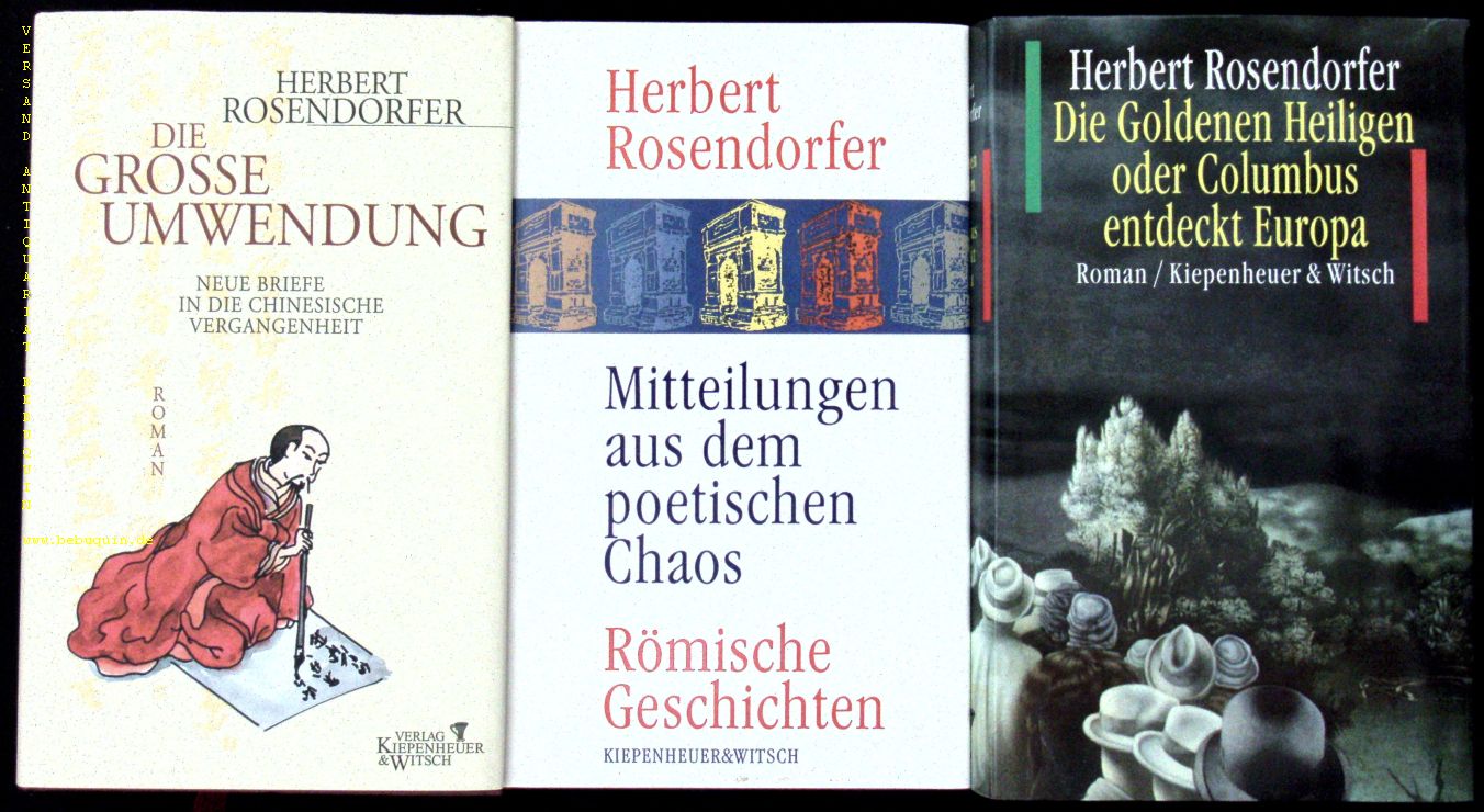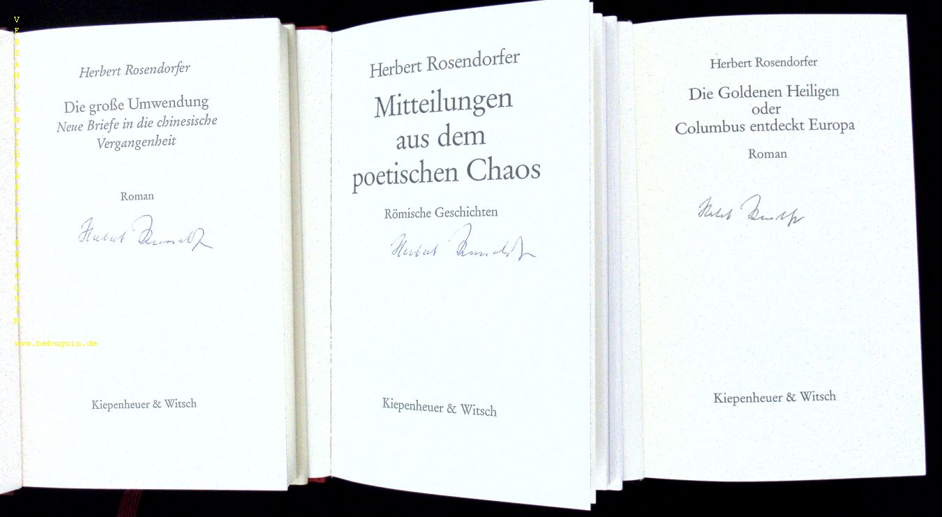 ROSENDORFER, Herbert: 3 signierte Ausgaben. 1. Die Goldenen Heiligen oder Columbus entdeckt Europa. 2. Mitteilung aus dem poetischen Chaos. 3. Die grosse Umwendung. 1 und 2 in EA sowie Nr. 3 in 2. Ausgabe. Köln (Kiepenheuer & Witsch), 1991 ff. jeweils ca 200 S. OLn mit OUmschl. 3 Bände jeweils mit der eigenhändigen Signatur des Verfassers auf Titelseite.