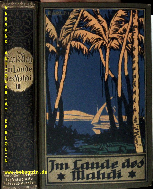 MAY, Karl: Im Lande des Mahdi. III. Band. 90.– 95. Tsd. Radebeul (Karl May), (1934). 566 (2) S. farb. ill. OLn. NaV, feines Ex. mit farsbstarkem Deckel und goldglänzendem Rücken. = Gesammelte Werke, Bd. 18. Hermesmeier / Schmatz GW 18.14.