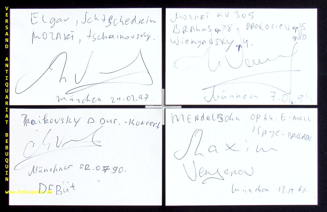 VENGEROW, Maxim (Violinist): 5 eigenhändig signierte und datierte Autogrammkarten. München (Herkulessaal), 1990 – 1997. 8 x 12,5 cm. 5 Karteikarten. Maxim Vengerov (* 15. August 1974 in Nowosibirsk) ist ein in Deutschland lebender russisch-israelischer Geiger, Musikpädagoge und seit 2006 Träger des Saarländischen Verdienstordens. (Wikipedia)