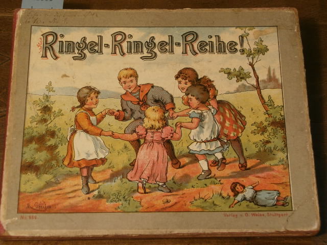 RINGEL – RINGEL – REIHE + UNSERE LIEBEN HAUSTIERE.– Stuttgart (Weise), (1895) 16 x 20,5 cm. 14 Bl. (einschl. Einband) als Leporello aus unrerreißbarem Karton mit jeweils 14 farblithogrphischen Bildtafeln von Margarete Pfeifer (Ringel Ringel Reihe) und Walter Zweigle (Unsere lieben Haustiere) auf den jeweiligen Rückseiten mit jeweils einem gereimten Vierzeiler zu jedem Bild. OHLn. Kanten etwas berieben, eine Ecke mit leichter Knickspur, insgesamt jedoch von sensationell guter Erhaltung. Sehr seltene EA dieses Leporello-Bilderbuchs. Beschrieben bei Ries (Pfeifer) 772 (6) und (Zweigle) 995 (50) mit unterschiedlicher Jahresangabe. Museumsstück.