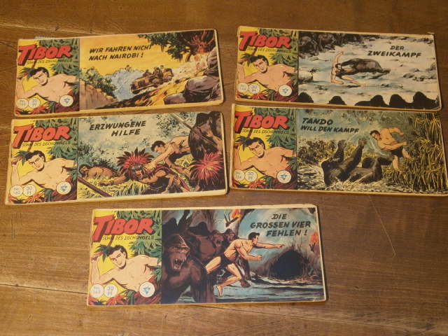 TIBOR.– Sohn des Dschungels. 5 Hefte der Reihe. Nr. 134, 144, 148, 160, 163. Hannover (Lehning), ca 1960. 7,5 x 17 cm. jeweils 36 S. mit Comic-Zeichnungen. farb. ill. OBr. teils ohne Clubmarke, teils fehlt die letzte Seite, sonst durchaus ordentlich erhalten. zusammen