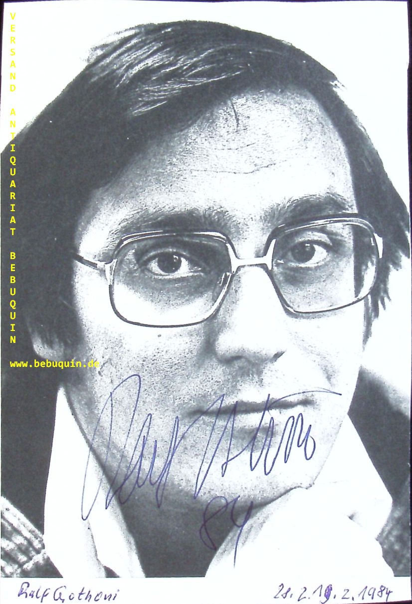 GOTHONI, Ralf (Pianist) : eigenhändig signierte und datierte Portraitseite. München (Philharmonie), 19.2.1984. 18 x 12,5 cm. 1 Bl. Ralf Georg Nils Gothóni (* 2. Mai 1946 in Rauma, Finnland) ist ein in Berlin lebender finnisch-deutscher Pianist, Dirigent, Komponist, Pädagoge und Essayist. (Wikipedia)
